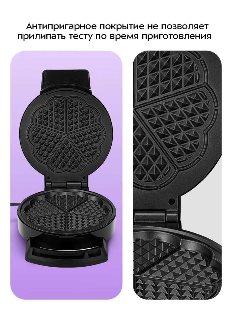 Антипригарное покрытие не дает прилипнуть тесту в процессе приготовления и позволяет готовить с минимальным количеством масла. Также антипригарное покрытие облегчает чистку панелей. Вафельница оснащена индикаторами питания и нагрева, а также термостатом для поддержания температуры панелей.