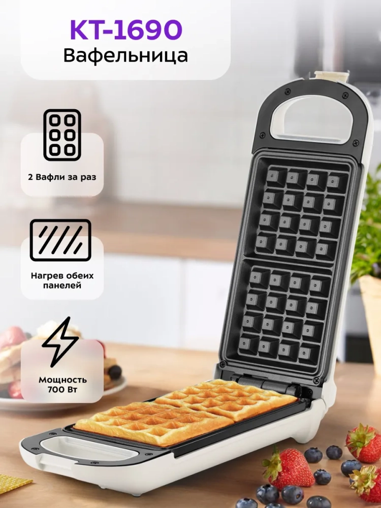 Электрическая вафельница Kitfort КТ-1690 — это идеальный прибор для приготовления вкусных и пышных бельгийских вафель. С помощью этой электровафельницы вы сможете насладиться ароматной выпечкой в любое время. Вафельница оснащена световыми индикаторами питания и нагрева, что позволяет легко контролировать процесс приготовления. Независимые нагреватели в каждой половинке формы обеспечивают равномерное распределение тепла, гарантируя идеальную текстуру каждой вафли. Корпус устройства выполнен из термоустойчивого пластика, что делает его безопасным в использовании даже при высоких температурах. Рабочие формы покрыты антипригарным покрытием, благодаря чему готовые вафли легко извлекаются без прилипания и повреждений. Противоскользящие ножки предотвращают скольжение прибора по столу во время работы, обеспечивая дополнительную устойчивость. В комплекте с электровафельницей поставляется удобная силиконовая кисточка для смазывания маслом поверхности рабочих панелей перед началом выпечки. Это помогает избежать прилипания теста и облегчает уход за устройством после готовки. Эта электрическая вафельница от Kitfort станет отличным дополнением к вашей кухне, позволяя быстро и просто готовить любимые десерты для всей семьи или гостей. Благодаря компактному дизайну она не займет много места на кухонном столе или в шкафу. С помощью данной модели можно экспериментировать с различными рецептами теста для получения разнообразных вкусовых сочетаний: от классических сладких до оригинальных соленых вариантов. Электровафельница Kitfort КТ-1690 — ваш надежный помощник в создании кулинарных шедевров!