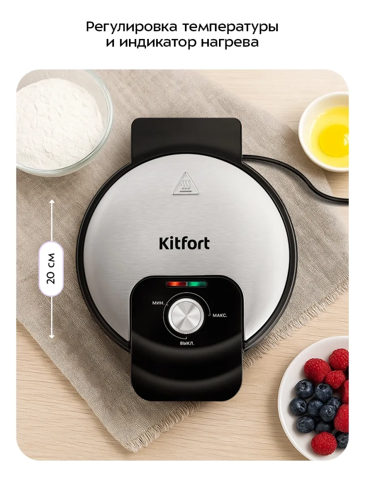 Вафельница оснащена индикаторами питания и нагрева, а также термостатом для поддержания температуры панелей. С помощью регулятора температуры вы сможете плавно менять температуру приготовления.