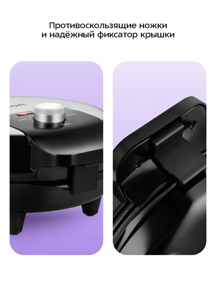 Противоскользящие ножки не дают прибору скользить по столу во время готовки. Специальный фиксатор позволяет фиксировать крышку в закрытом состоянии.