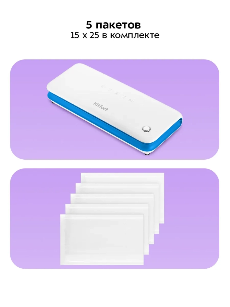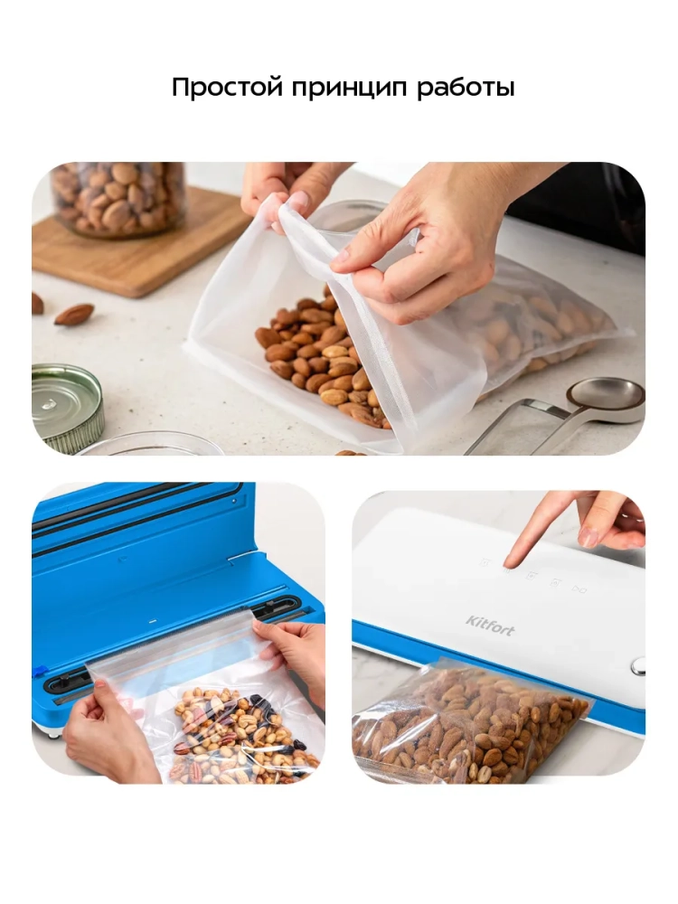 Вакууматор Kitfort КТ-1562 прост в использовании. Продукт необходимо положить в специальный пакет, предназначенный для вакуумирования. Затем нужно поместить открытый край пакета в вакуумную камеру и включить прибор в нужном режиме. Вакууматор удалит из пакета воздух. В результате образования вакуума пакет будет плотно обжимать содержимое. Как только воздух будет удален, включится запечатывание открытой стороны пакета. За счет этого воздух уже не сможет проникнуть внутрь.