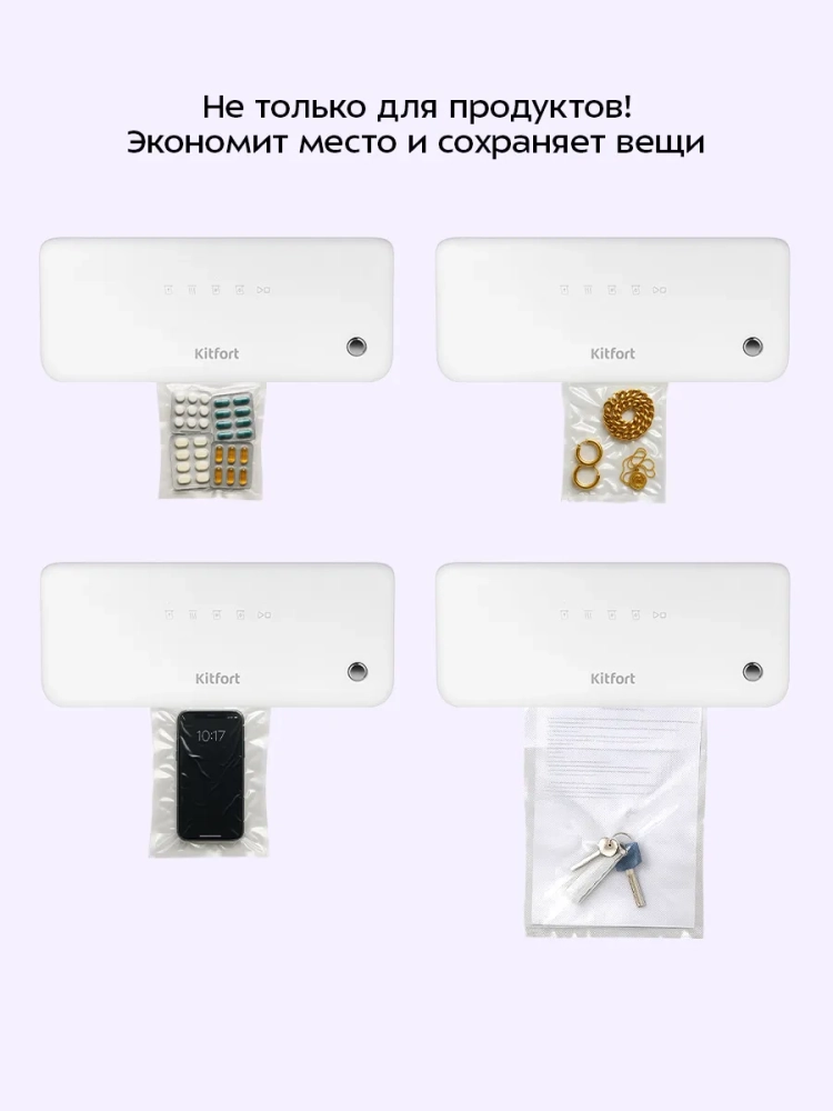 В вакууматоре KT-1562 есть возможность вакуумирования сухих и влажных продуктов. Вы можете запечатать пакет без предварительного вакуумирования. Также у прибора есть режим вакуумирования, в котором вы можете контролировать время вакуумирования самостоятельно. Данный режим также удобно использовать для вакуумирования продуктов в специальных контейнерах (шланг, насадки и контейнер в комплект не входят и приобретаются отдельно).
