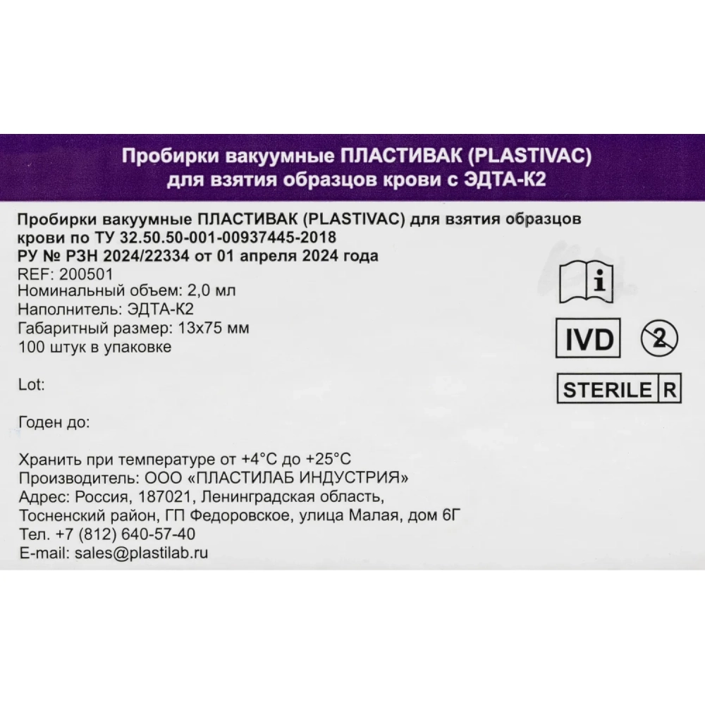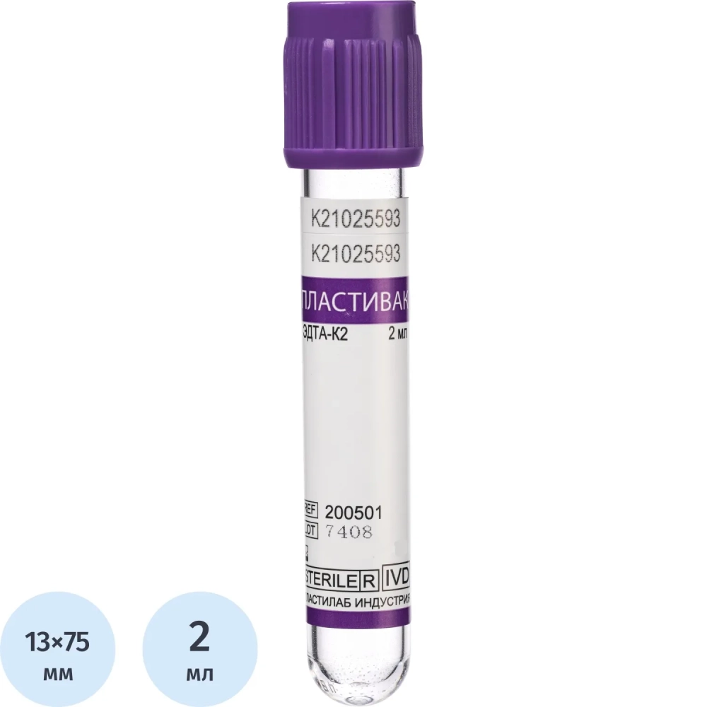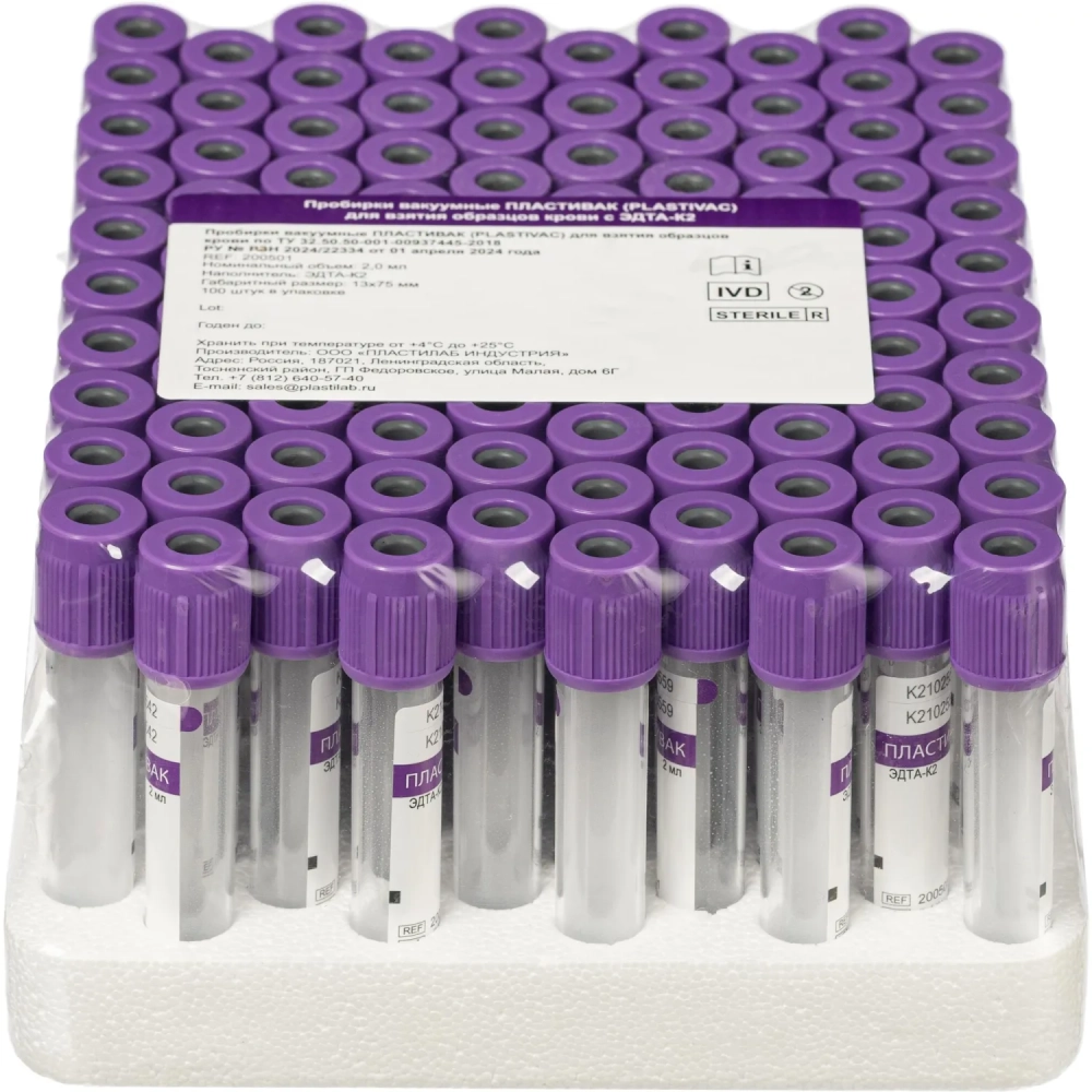 Вакуумные пробирки ПЛАСТИВАК ЭДТА К2 Лиловая крышка 2мл 13х75мм 100 шт/уп