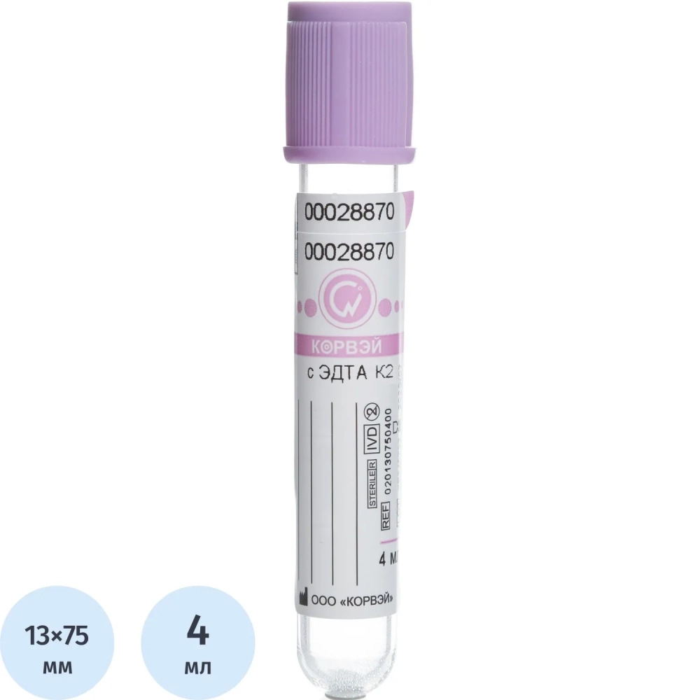 Вакуумные пробирки с ЭДТА-К2, 4мл, 13х75 мм Корвэй 100шт/уп