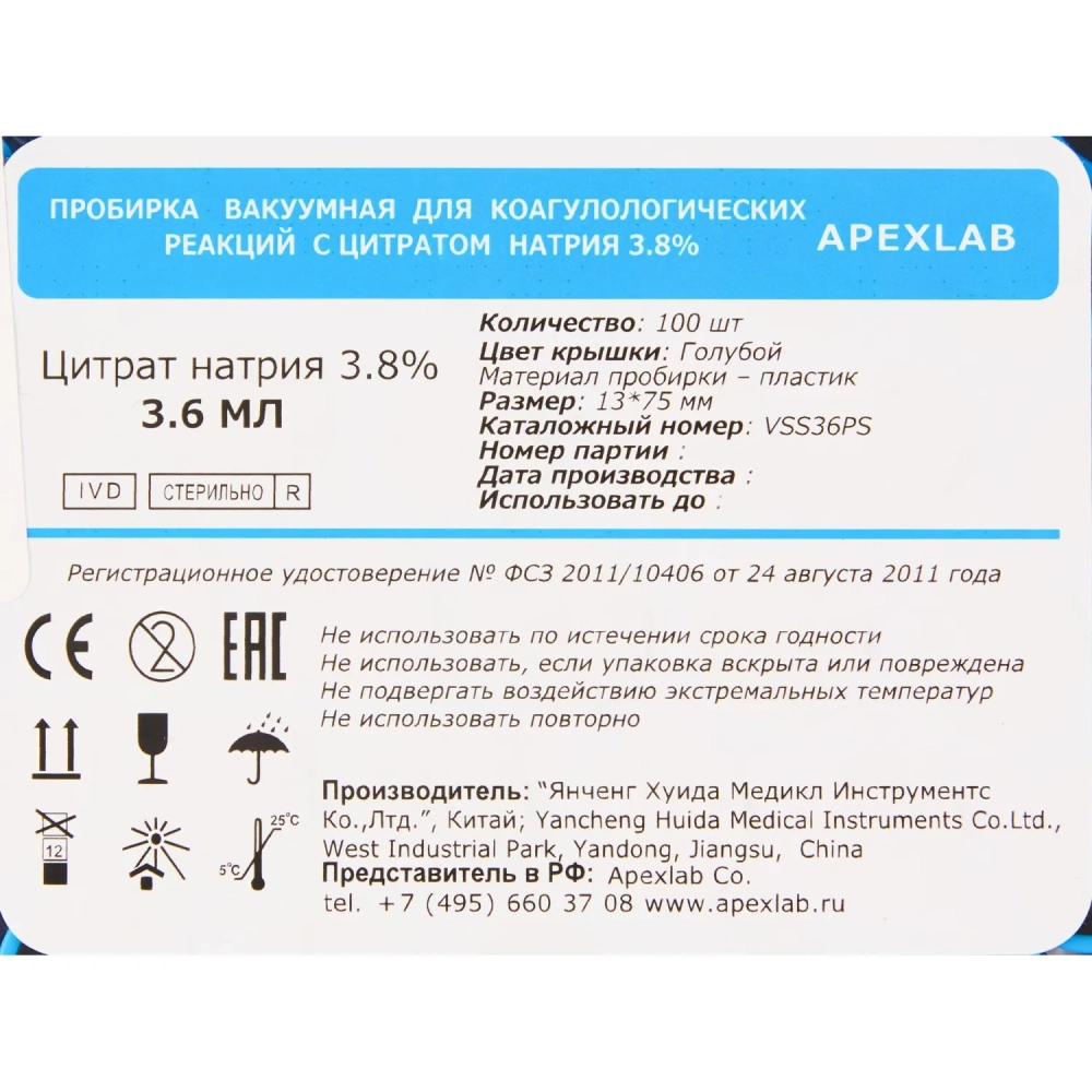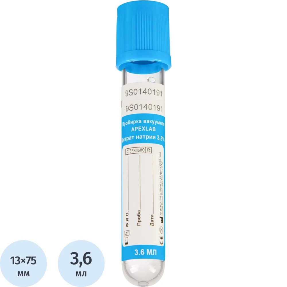 Вакуумные пробирки с Na цитрат 3,8% 3,6 мл, 13х75 мм, APEXLAB 100 шт/уп