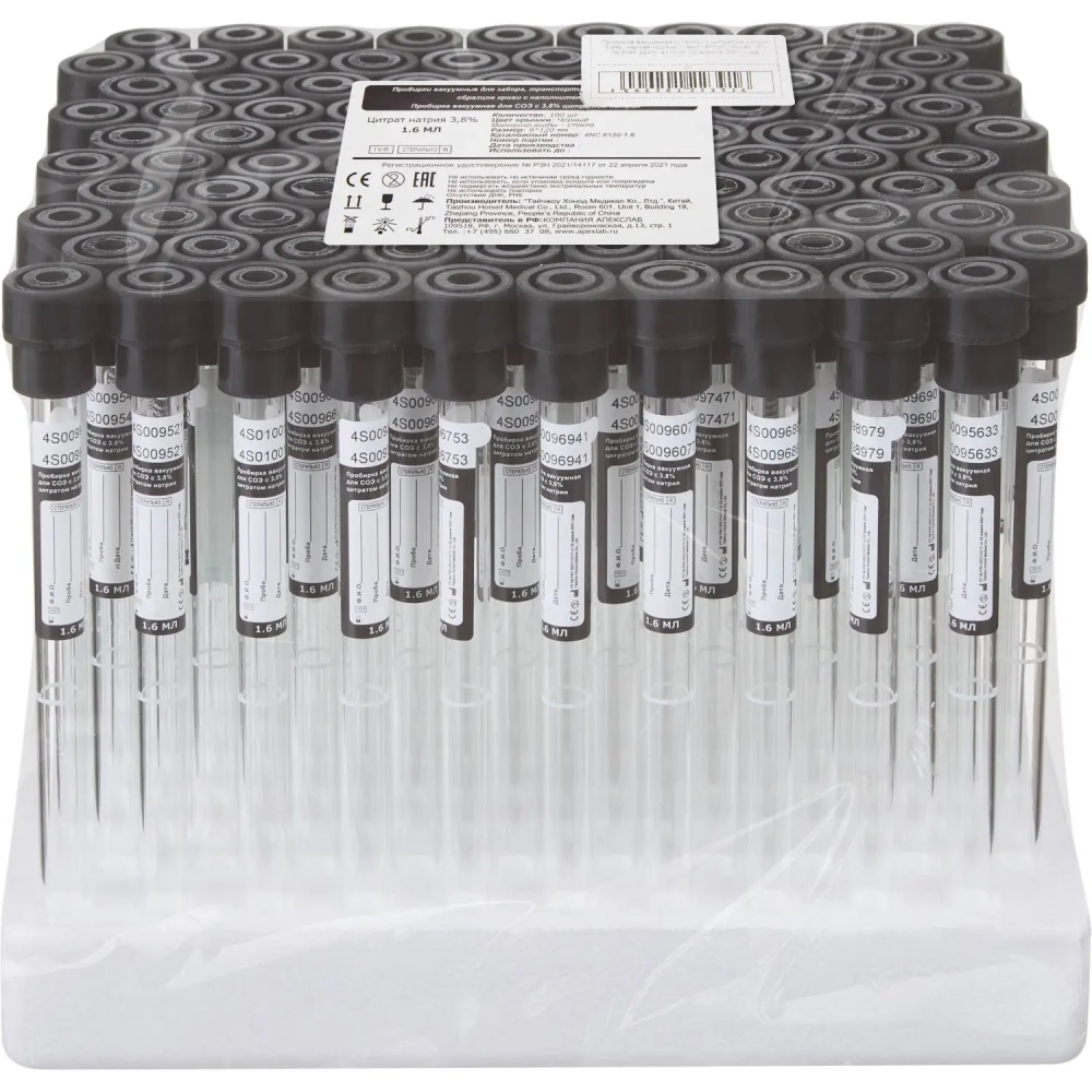 Вакуумные пробирки стекл с NaЦитр 3,8% черн кр 1,6мл 8x120мм Китай 100шт/уп