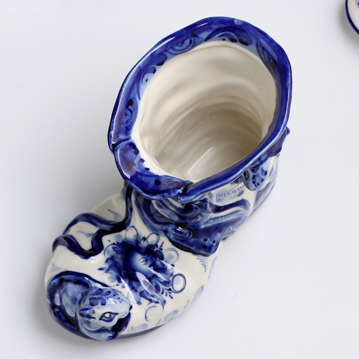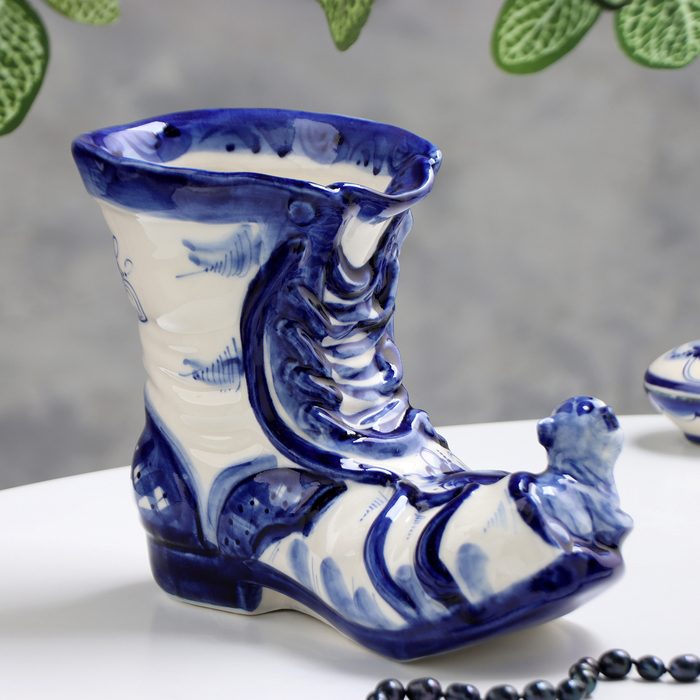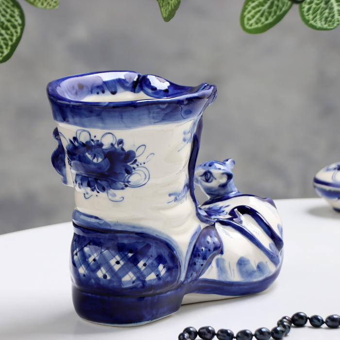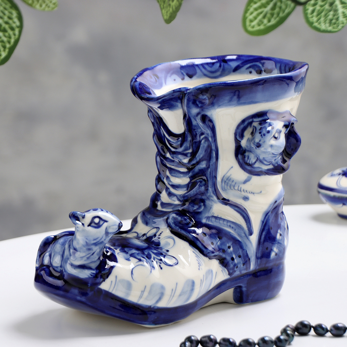 Ваза-карандашница "Сапожок с мышками", гжель, фарфор, 16х19 см