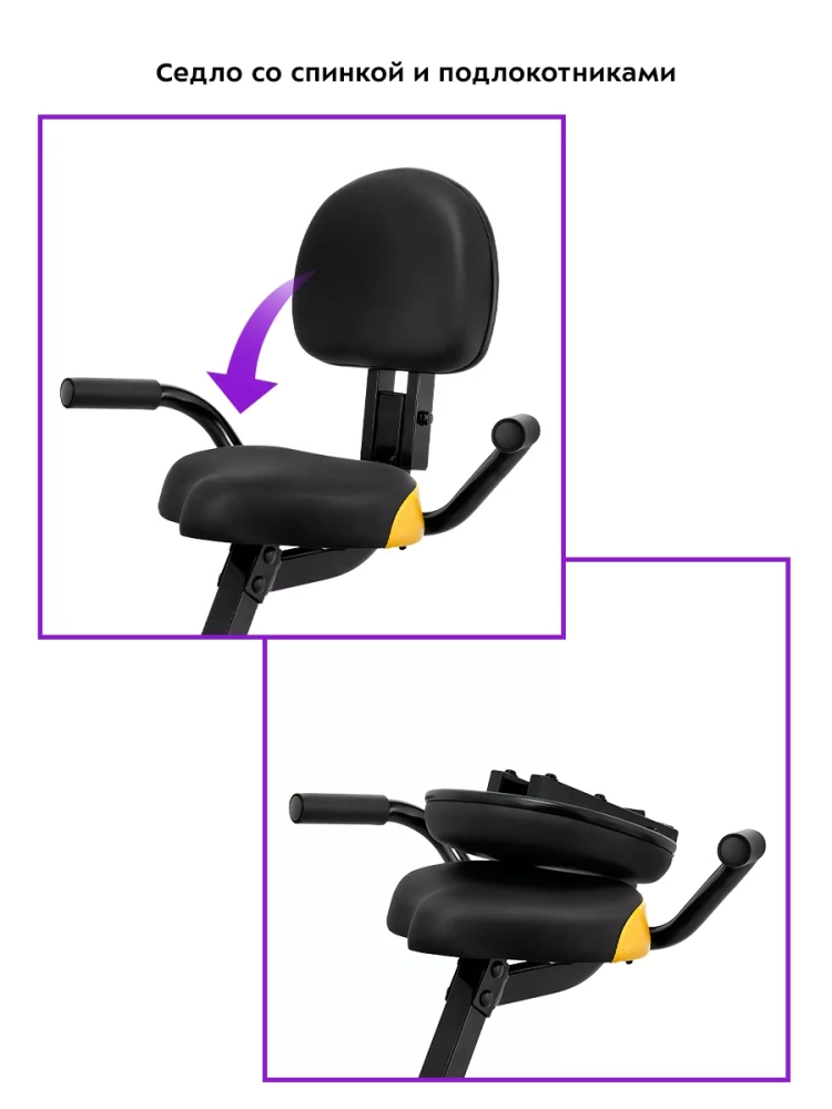 Седло велотренажера Китфорт KT-4006 выполнено в виде сидения с спинкой и подлокотниками. Велотренажер складывается для хранения, так что устройство не займет много места в квартире. Также устройство оснащено колесиками, чтобы вы могли легко перемещать его, и подставкой для планшета на руле, куда вы можете установить планшет или смартфон на время тренировки.