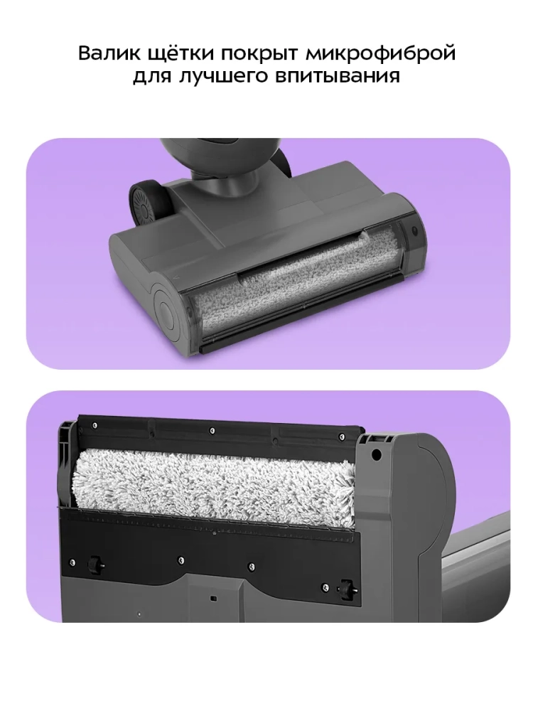 Пылесос оснащен турбощеткой с валиком, который покрыт микрофиброй — материалом, хорошо впитывающим воду.