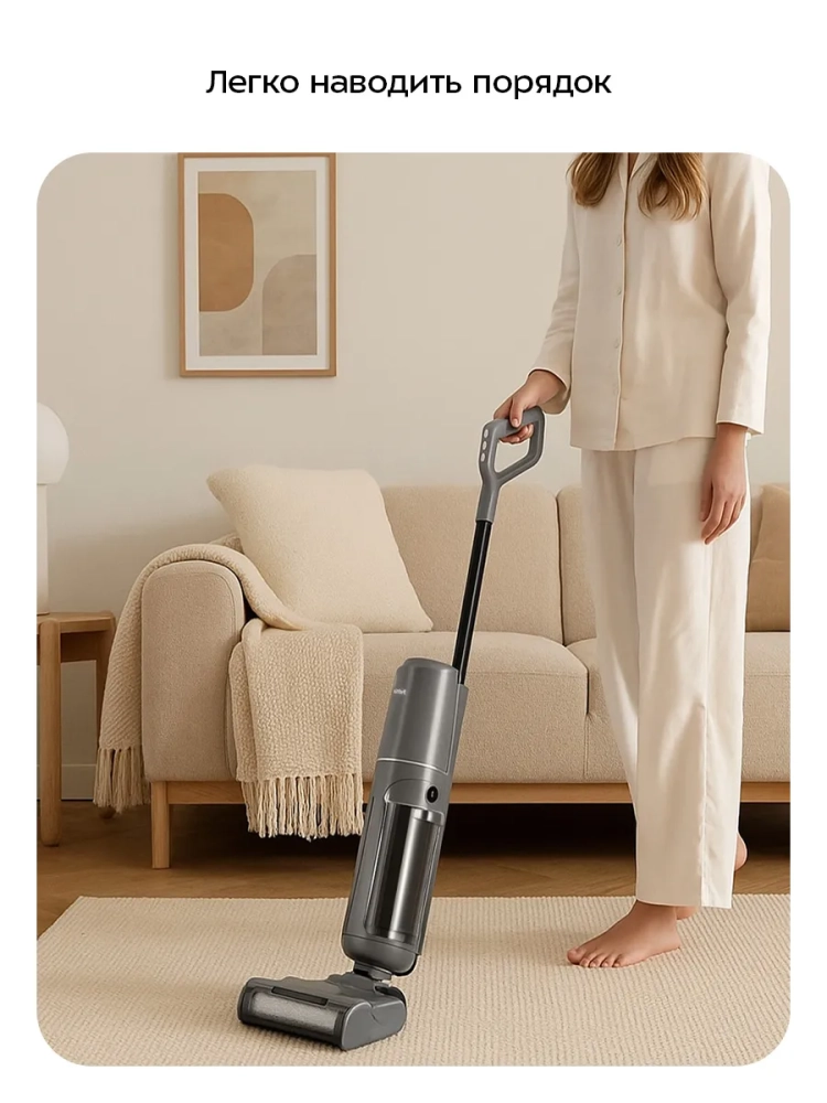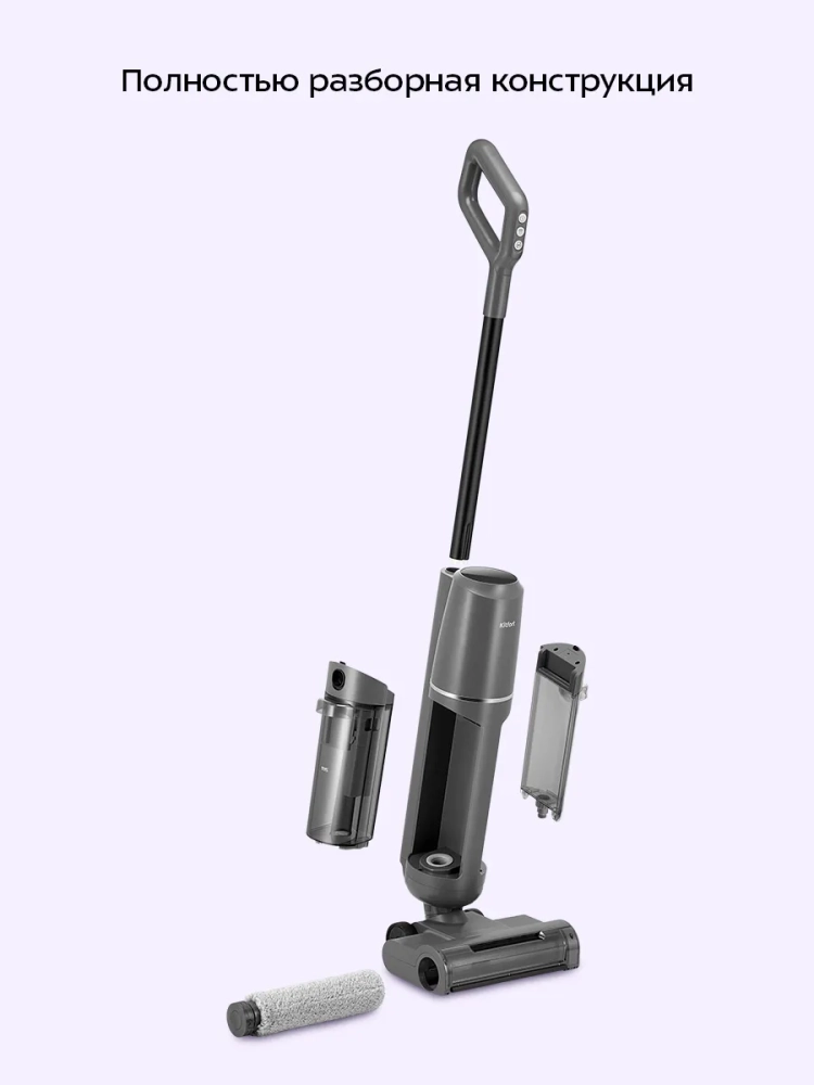 Удлинительная ручка съемная, поэтому прибор можно разобрать для компактного хранения. На базе для зарядки есть отсеки для просушки и хранения валика турбощетки и фильтра тонкой очистки. У прибора есть голосовой помощник.