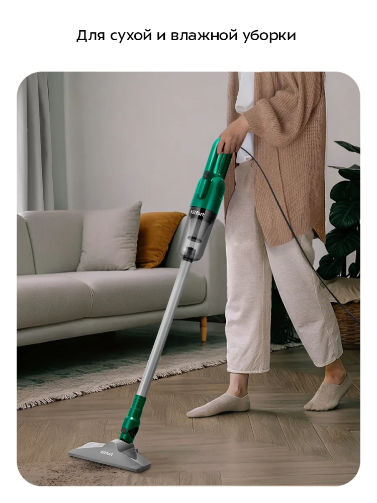 Вертикальный пылесос 3 в 1 КТ-5363 от Kitfort — это универсальное бытовое решение для уборки вашего дома. Этот мощный и компактный прибор позволяет проводить как сухую, так и влажную уборку, что делает его незаменимым помощником в быту. Благодаря своей конструкции, пылесос легко трансформируется из вертикального в ручной, что особенно удобно для очистки труднодоступных мест. Техника оснащена емкостью пылесборника на 1 литр и резервуаром для воды объемом 350 мл, что обеспечивает длительную работу без необходимости частой очистки контейнера. Мощность устройства составляет 700 Вт, а длина шнура — 3,8 метра, что позволяет свободно перемещаться по комнате во время уборки. Этот проводной вертикальный пылесос идеально подходит для чистки дивана, ковра и пола благодаря специальным насадкам. Он с легкостью справляется с удалением пыли с обивки мебели, аксессуаров или ковриков в салоне автомобиля. Для мытья полов достаточно присоединить насадку для влажной уборки: вода подается из резервуара через специальные отверстия на тряпку при надавливании. Компактные размеры (270 × 160 × 1160 мм) делают его удобным для хранения даже в небольших помещениях. Уровень шума не превышает ≤80 дБ, обеспечивая комфортное использование без лишнего дискомфорта. Класс фильтра тонкой очистки H6 гарантирует высокое качество фильтрации воздуха во время работы устройства. Пылесос также обладает классом защиты II от поражения электрическим током при напряжении ~220−240 В и частоте тока 50/60 Гц. Этот моющий вертикальный пылесос станет отличным выбором как для генеральной уборки всего дома или квартиры, так и для оперативного наведения порядка после неожиданных загрязнений.