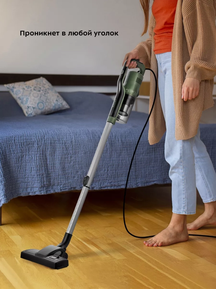 Одно из главных достоинств вертикального пылесоса — его компактность. Во время работы пылесос благодаря своей маневренности может легко убраться в узком коридоре или комнате, заполненной различными предметами. У пылесоса нет функции вертикальной парковки, поэтому пылесос рекомендуется устанавливать на стену с помощью кронштейна, идущего в комплекте.