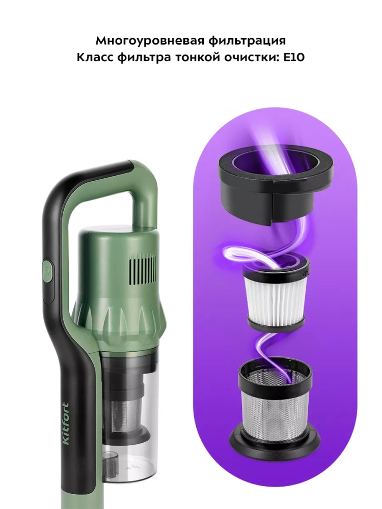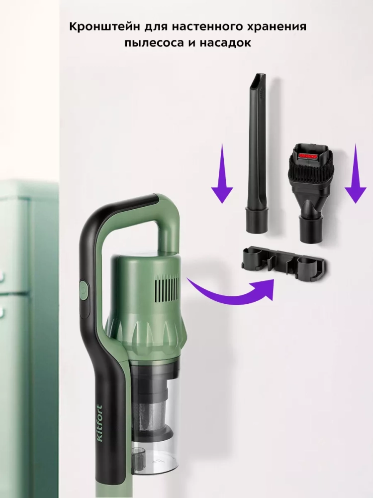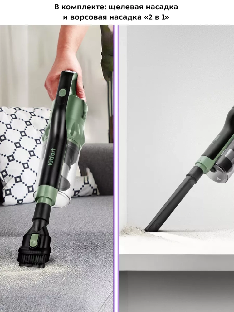 Вертикальный пылесос Kitfort КТ-5237 очень удобен при локальной уборке. Он компактен, всегда под рукой и готов к работе. При отсоединении удлинительной трубки и установке насадки он превращается в ручной пылесос. Его конструкция позволяет легко проникать в самые труднодоступные уголки квартиры. При этом не нужно передвигать громоздкий корпус прибора и управляться с непослушным шлангом. Пылесос оснащен маневренной напольной щеткой, которая вращается в двух плоскостях.