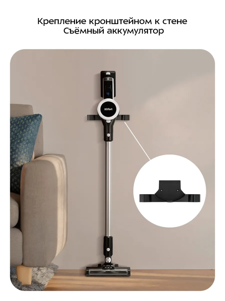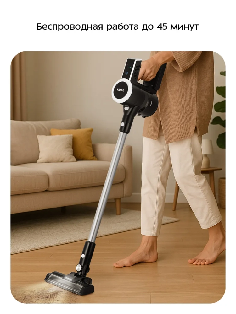 Беспроводной вертикальный пылесос Kitfort КТ-5393 очень удобен при локальной уборке. Он компактен, всегда под рукой и готов к работе. При отсоединении удлинительной трубки и установке насадки он превращается в ручной пылесос. Его конструкция позволяет легко проникать в самые труднодоступные уголки квартиры. При этом не нужно передвигать громоздкий корпус проводного пылесоса и управляться с непослушным шлангом. Благодаря работе от аккумулятора не нужно включать вилку в розетку, провода не мешают под ногами. Поэтому пылесос имеет неограниченный радиус действия: от любого уголка квартиры до машины или беседки в саду. Пылесос оснащен маневренной напольной турбощеткой, которая вращается в двух плоскостях.