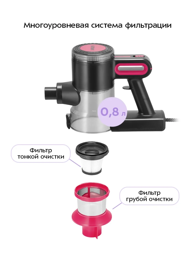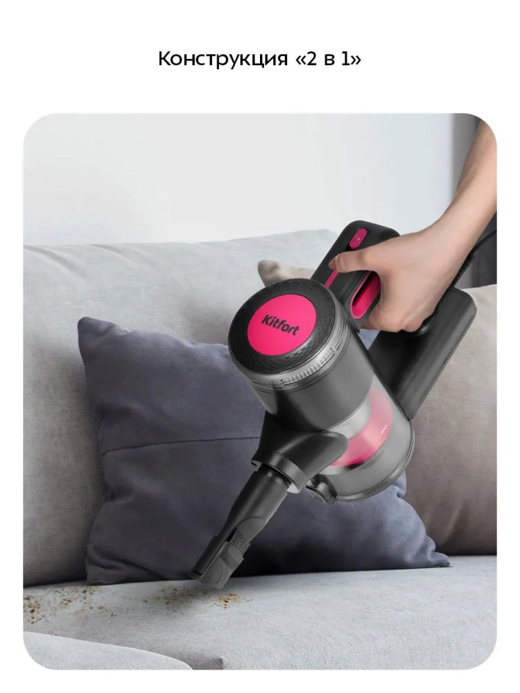 Конструкция «2 в 1» предусматривает наличие ручного пылесоса, который удобно использовать отдельно. Ручным пылесосом можно пропылесосить углы и плинтусы, обивку мебели, пыль со шкафов, шкафчики на кухне или в гостиной, книжные полки, коврики в автомобиле или багажник.