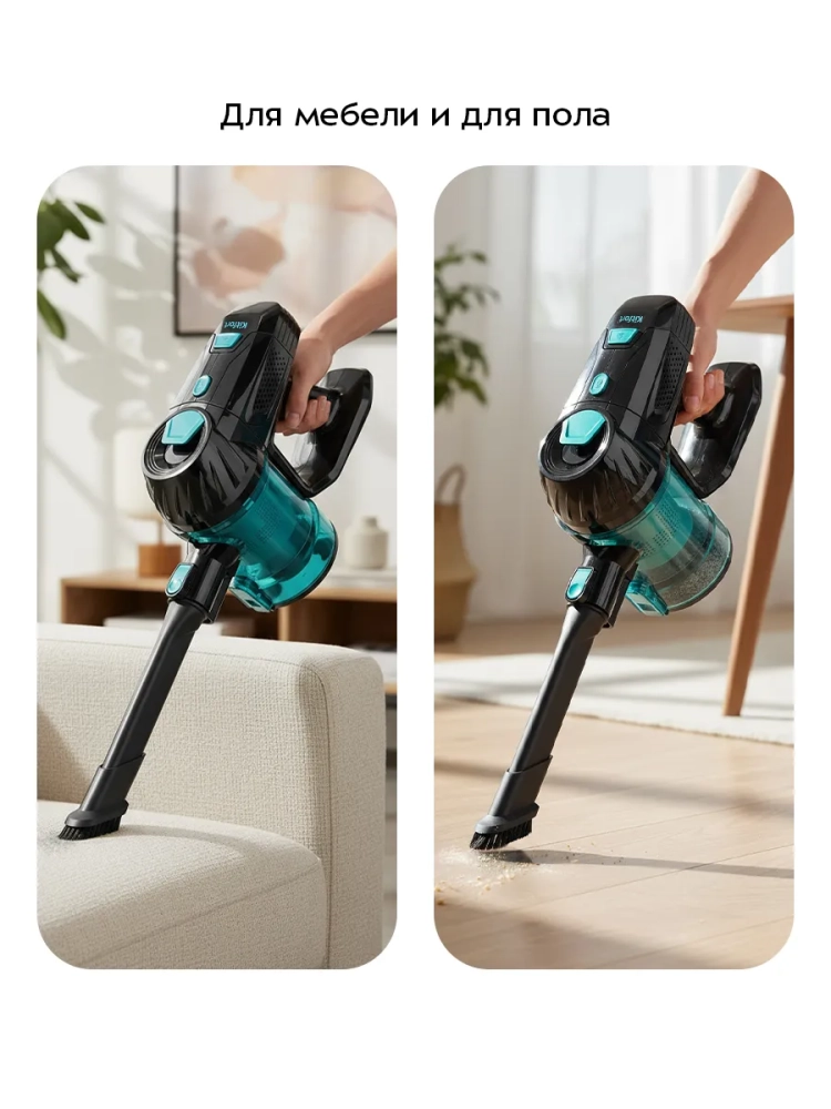 Пылесос работает от аккумулятора, что обеспечивает неограниченный радиус действия: от любого уголка квартиры до машины или беседки в саду. Аккумулятор является съемным, что делает процесс зарядки удобным (не нужно искать розетку, рядом с которой поместится пылесос), а также обеспечивает более безопасную транспортировку пылесоса.