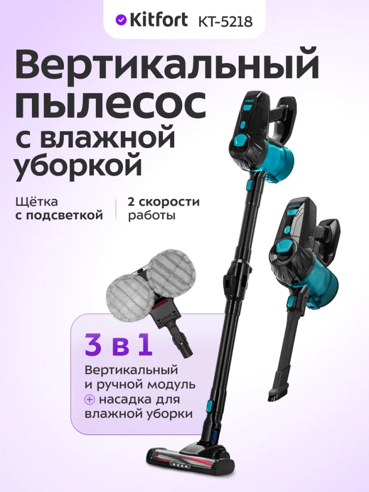 Вертикальный пылесос с влажной уборкой Kitfort КТ-5218 позволяет проводить сухую и влажную уборку, он удобен при локальной и генеральной уборке. Пылесос всегда под рукой и готов к работе, а при желании он легко трансформируется в ручной пылесос. Пылесос оснащен маневренной напольной щеткой с подсветкой. Также в комплекте идет моющая насадка с вращающимися дисками, на которые крепятся тряпки для мытья пола. Благодаря такой конструкции вы сразу можете протереть участок пола, который только что пропылесосили, это позволяет экономить время и делает уборку более эффективной.