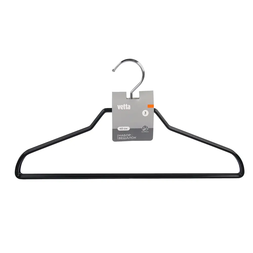 Набор из трёх вешалок для одежды VETTA длиной 40 см выполнен из прочного металла с ПВХ-покрытием, которое предотвращает скольжение и защищает одежду от заломов. Надёжная конструкция подходит для рубашек, блузок, лёгких жакетов и курток, обеспечивая аккуратное хранение и порядок в гардеробе. Компактный размер делает их удобными для использования в шкафах любого типа. В ассортименте.