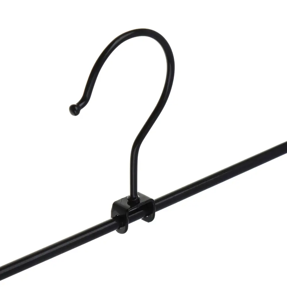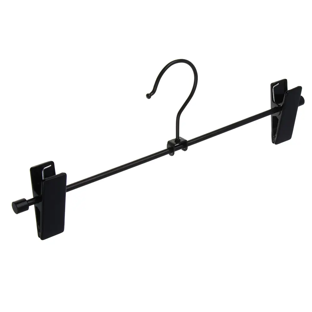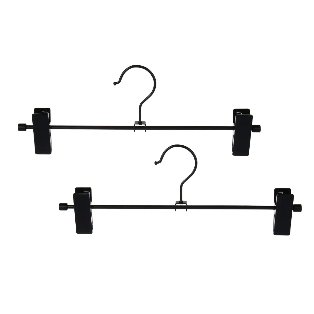 Набор из двух вешалок с подвижными зажимами идеально подходит для хранения юбок и брюк. Каждая вешалка имеет размеры 31 см в длину и 6 см в ширину, выполнена из ПВХ и металла чёрного цвета. Зажимы обеспечивают надёжную фиксацию одежды, а прорезиненные клипсы с зубчиками предотвращают скольжение и повреждение ткани. Этот набор вешалок станет отличным дополнением вашего гардероба и поможет организовать хранение вашей одежды.