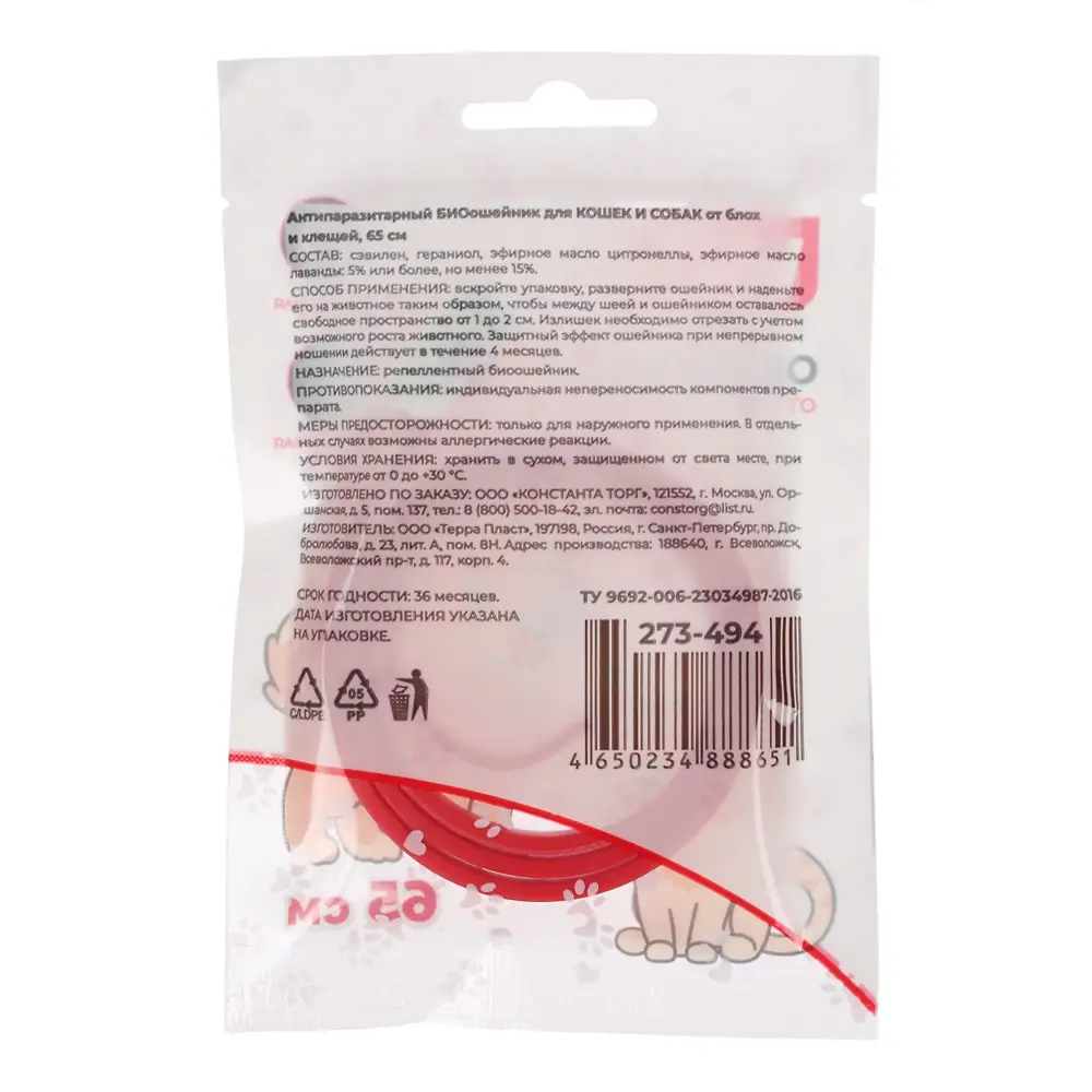 VETTA Антипаразитарный БИОошейник для КОШЕК И СОБАК от блох и клещей, 65 см