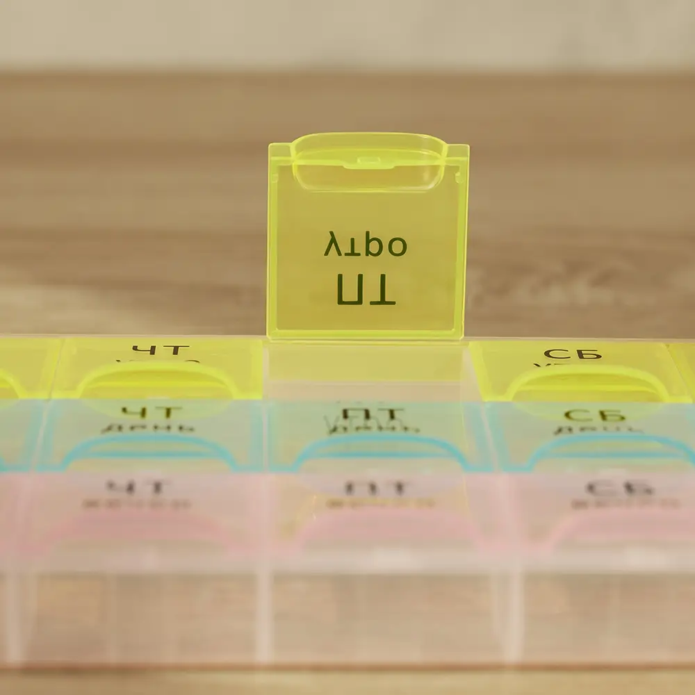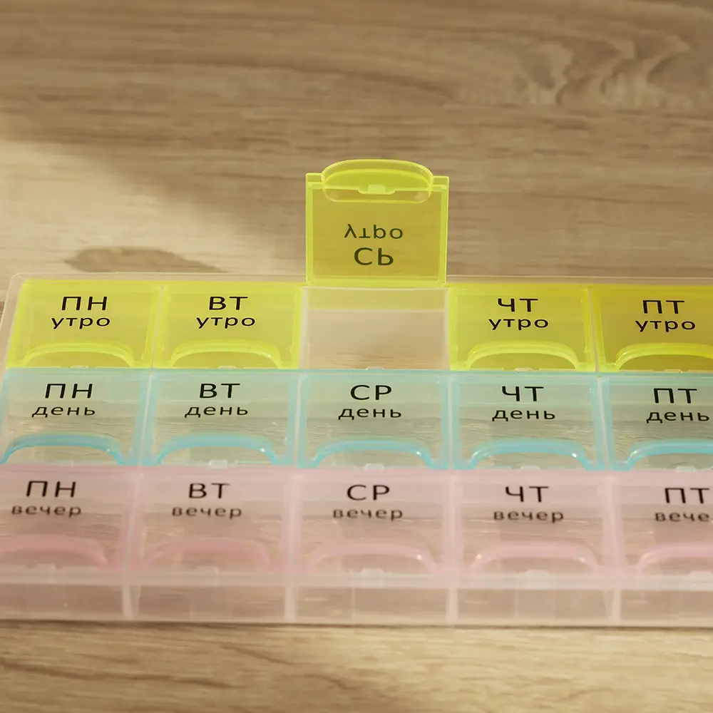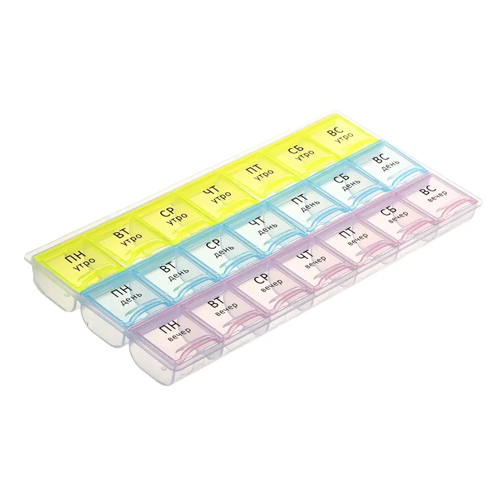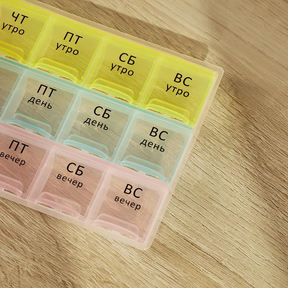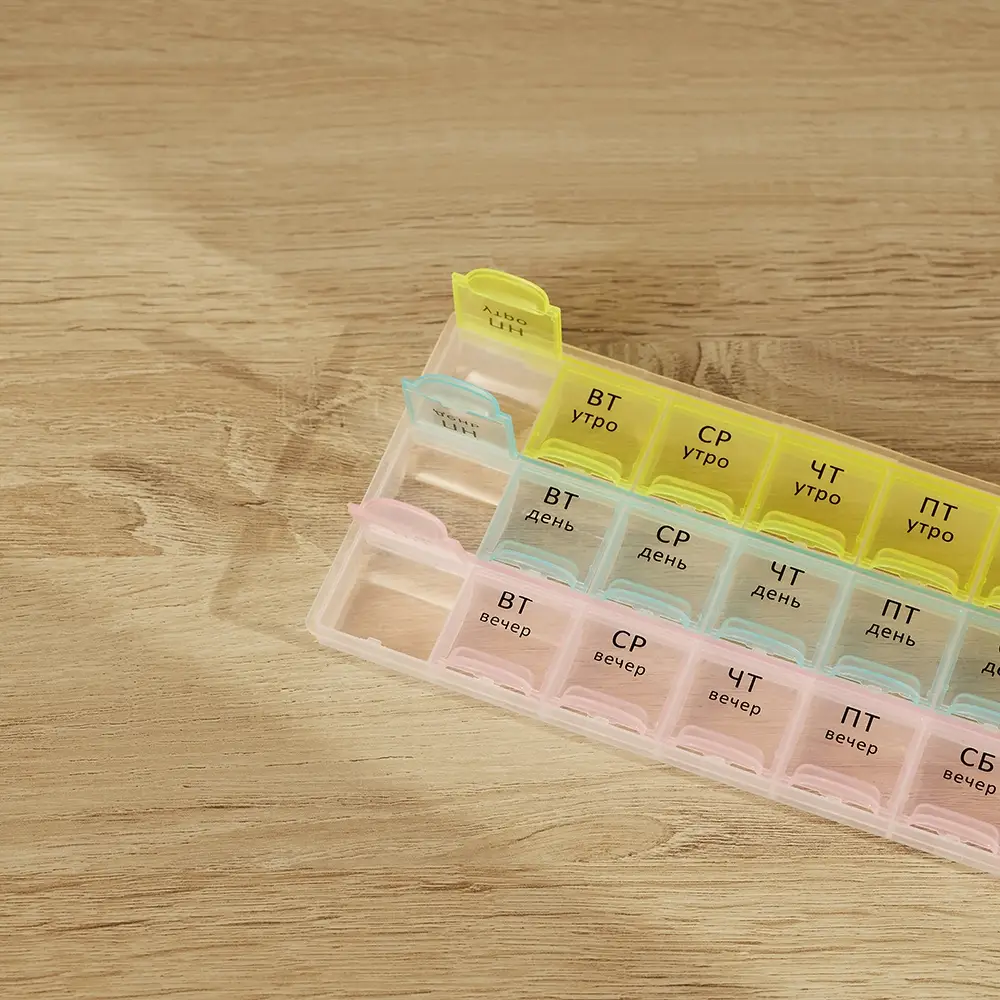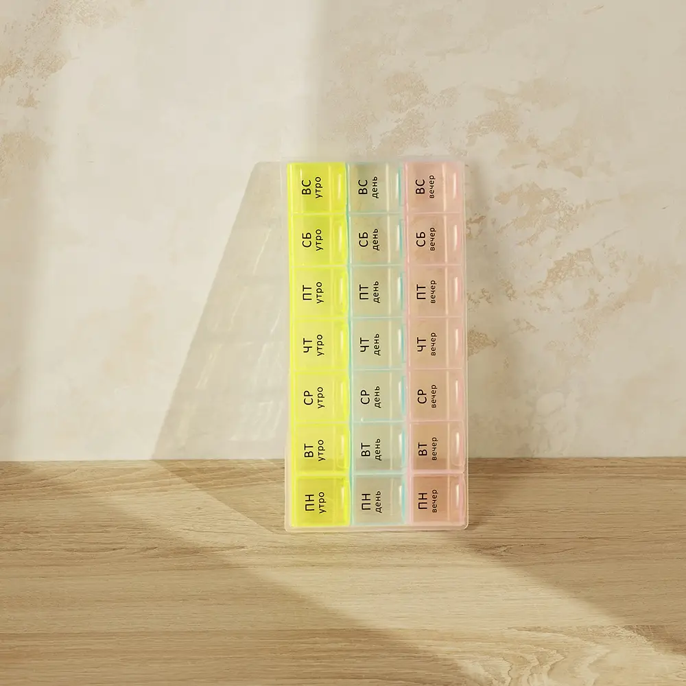 Врач выписал препараты для ежедневного приема строго в определенное время суток? Чтобы не держать лишнюю информацию в голове и не пропустить прием лекарств, витаминов или БАДов, был создан Бокс для таблеток VETTA. Пластиковый бокс имеет 21 отсек с маркировкой по дням недели и времени суток – утро, день и вечер. В каждый отсек поместится несколько таблеток или капсул. Заготовьте препараты заранее и вам не придется вспоминать, приняли ли вы лекарство в нужное время.
