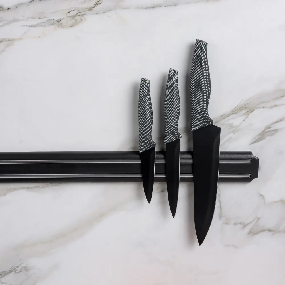 Магнитный держатель для ножей 50x5 см - идеальное решение для современной кухни! Стильный и практичный аксессуар поможет вам разместить все ножи на видном месте, обеспечивая порядок и безопасность. Крепится на стену, экономит пространство рабочей зоны, не загромождает столешницу. Ножи легко снимаются и фиксируются обратно, на держателе расположены отдельно, не царапаются друг о друга. Открытая подвесная конструкция препятствует размножению микробов за счет постоянной циркуляции воздуха. Для удобства крепится к стене при помощи двух шурупов с дюбелями (в комплекте).