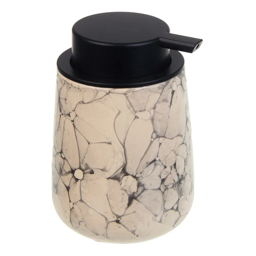 Элегантный дозатор VETTA «Космос» для жидкого мыла - стильное и практичное решение для вашей ванной комнаты! Объем 320 мл позволяет всегда иметь под рукой достаточное количество моющего средства, при этом дозатор сохраняет компактные размеры, которые не займут много места на полке или в мыльнице. Размеры 13x9x9 см идеально подходят для размещения в любом пространстве ванной комнаты. Компактный и эргономичный дизайн позволяет удобно держать дозатор в руке и использовать его без лишних усилий. Высококачественная керамика с уникальным мраморным узором молочного цвета, украшенным изящными вкраплениями, придает диспенсеру роскошный и современный вид. Черный механический дозатор выделяется на фоне белоснежной керамики, создавая стильный контраст.