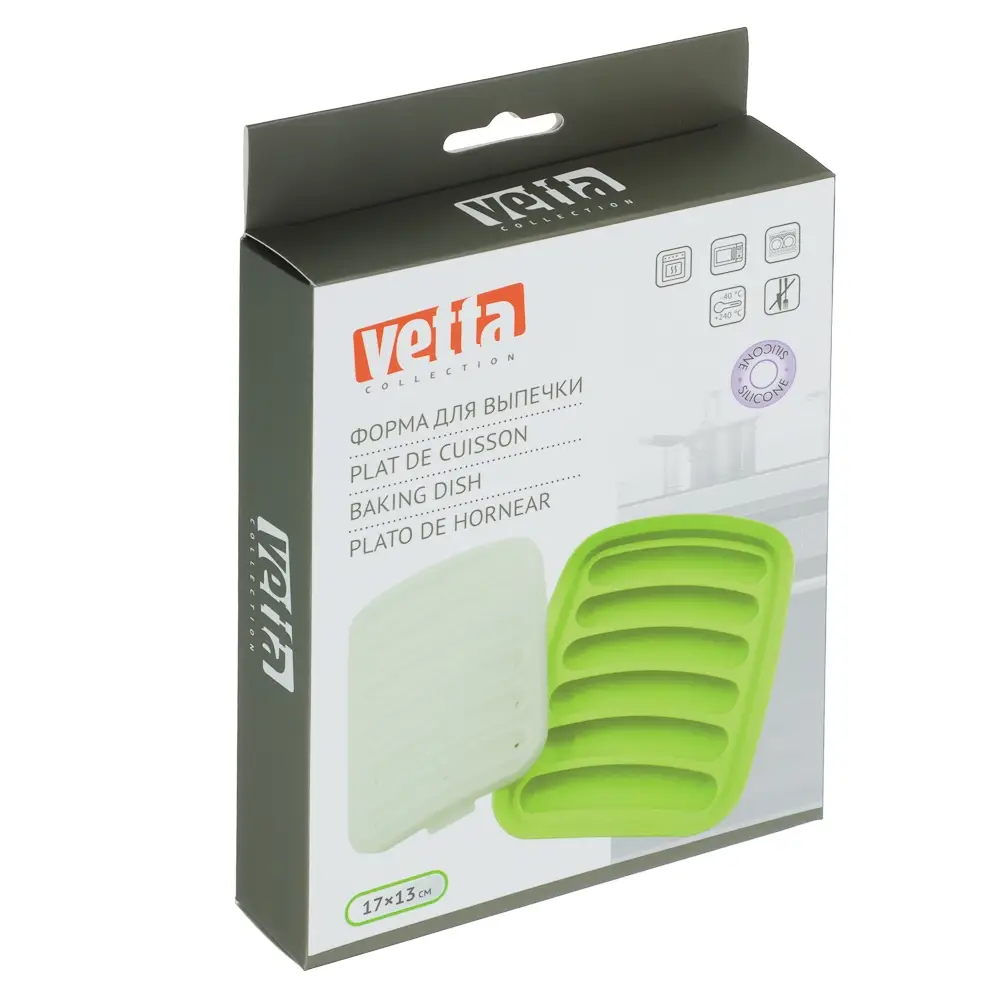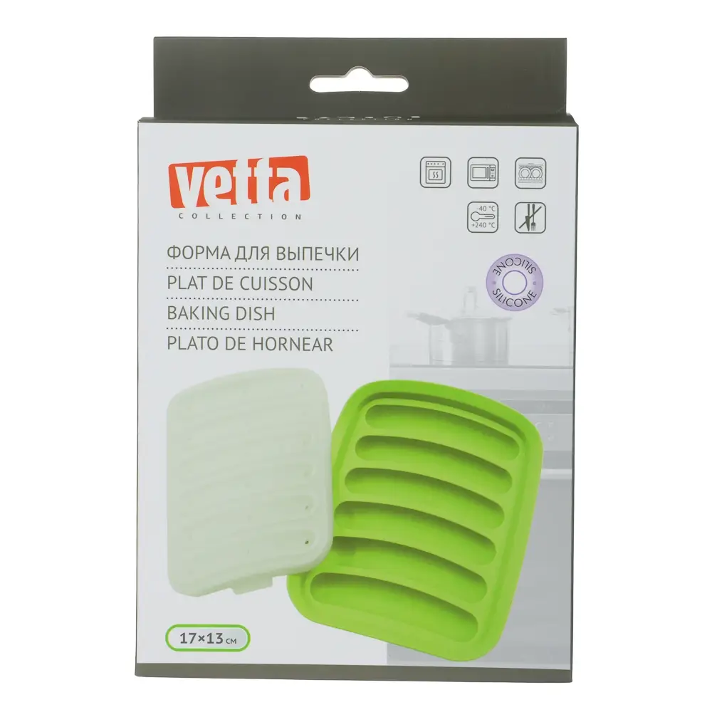 Удобная форма для выпечки с крышкой 17х13 см из пищевого силикона VETTA — ваш надёжный помощник на кухне, когда нужно быстро и легко приготовить сосиски, колбаски, кебабы или другие продукты. Форма имеет 6 отсеков, которые держат продукт и не дают ему терять форму во время запекания. Благодаря материалу, мясо легко вынимается, а форма — просто моется. Прозрачная силиконовая крышка защищает блюдо от пересыхания, удерживает влагу и позволяет наблюдать за процессом приготовления без открывания. Также она подходит для хранения готовых продуктов в холодильнике. Идеально подходит для запекания в духовке, микроволновке, а также для использования в пароварке. Можно мыть в посудомоечной машине и ставить в морозилку.