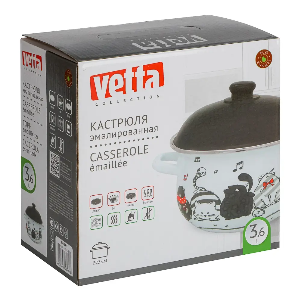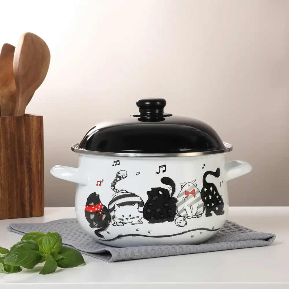 Эмалированная кастрюля VETTA "Хвостатые друзья" объемом 3,6 л сочетает практичность и выразительный дизайн. Корпус из стали с эмалированным покрытием обеспечивает равномерное нагревание и сохраняет вкусовые качества продуктов. Белая поверхность украшена рисунками кошек, добавляя индивидуальность и создавая уютную атмосферу на кухне. Диаметр 24 см оптимален для приготовления супов, гарниров и тушеных блюд. Черная крышка плотно прилегает, позволяя сохранить тепло и сократить время готовки. Кастрюля совместима со всеми типами варочных поверхностей, включая индукционные плиты. Эмалированное покрытие устойчиво к царапинам и не впитывает запахи, а уход упрощается благодаря возможности мытья в посудомоечной машине. Привлекательный выбор для тех, кто ищет сочетание удобства и эстетики.