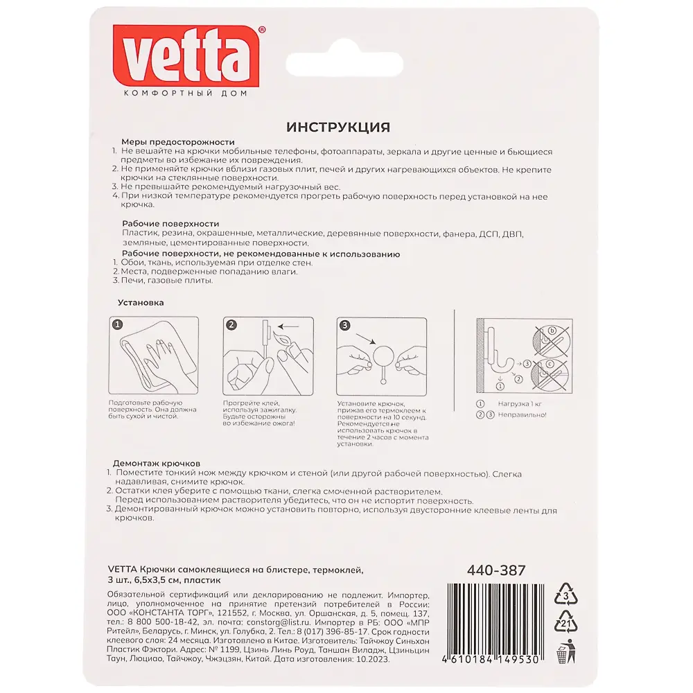 Приобретите универсальные самоклеящиеся крючки VETTA! Сделанные из прочного пластика размером 6,5х3,5см, они надежно удерживают любые предметы на своем месте. В комплекте идут 3 крючка, которые легко приклеиваются на любую поверхность благодаря термоклею. Идеально подходят для кухни, ванной или прихожей. Ваш дом станет организованнее с крючками VETTA!