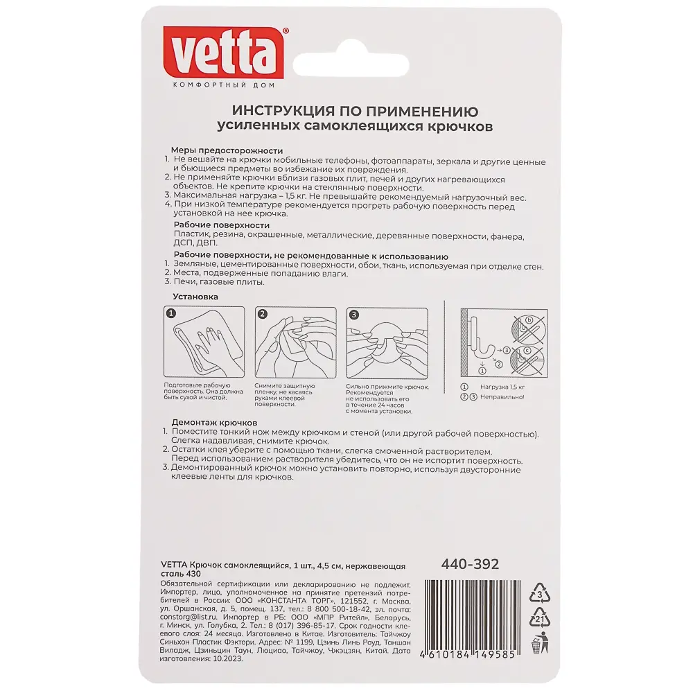 Представляем вашему вниманию самоклеящийся крючок VETTA из нержавеющей стали 430. Диаметр крючка составляет 4,5 см, что позволяет использовать его для различных предметов. Удивительно прочный и надежный, этот крючок легко устоят нагрузку, сохраняя при этом свою форму. Благодаря самоклеящейся основе, установка занимает всего несколько секунд и не требует дополнительных инструментов. Идеально подходит для ванной комнаты, кухни или гостиной. Приобретите крючок VETTA и убедитесь в его удобстве и функциональности!