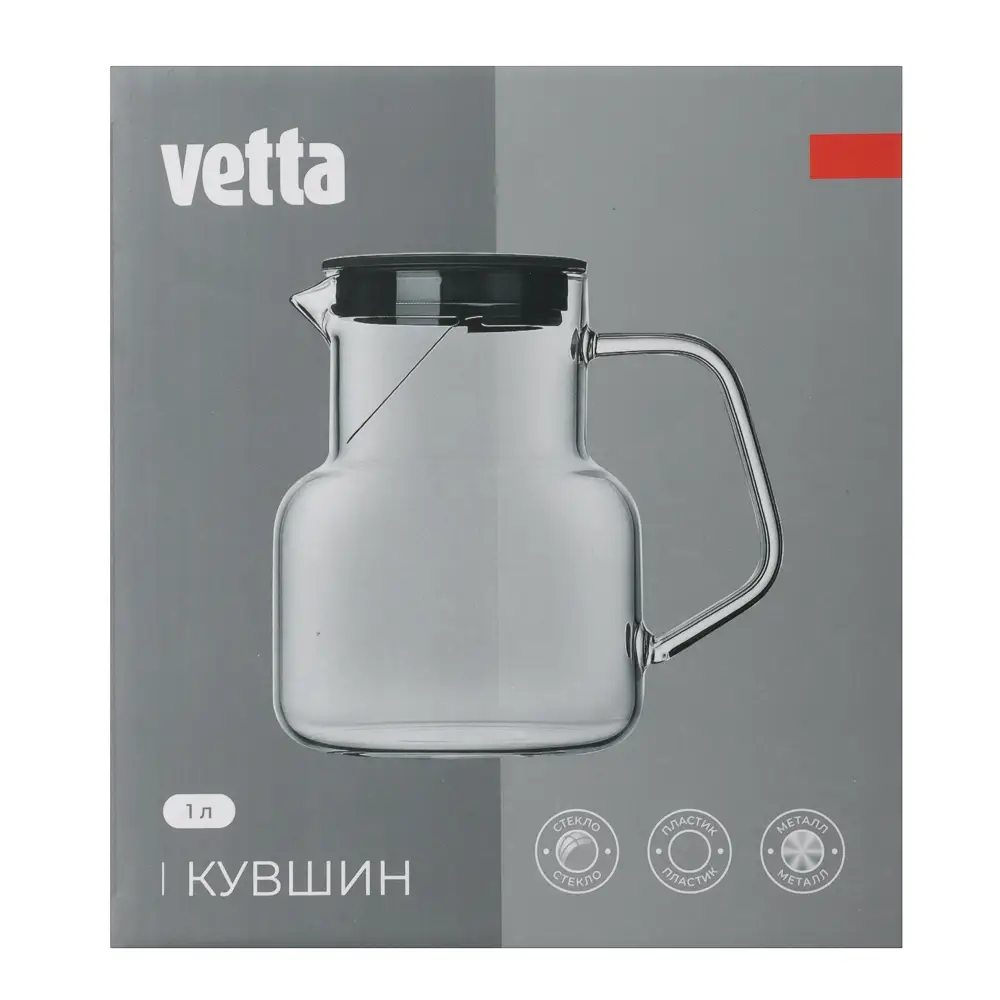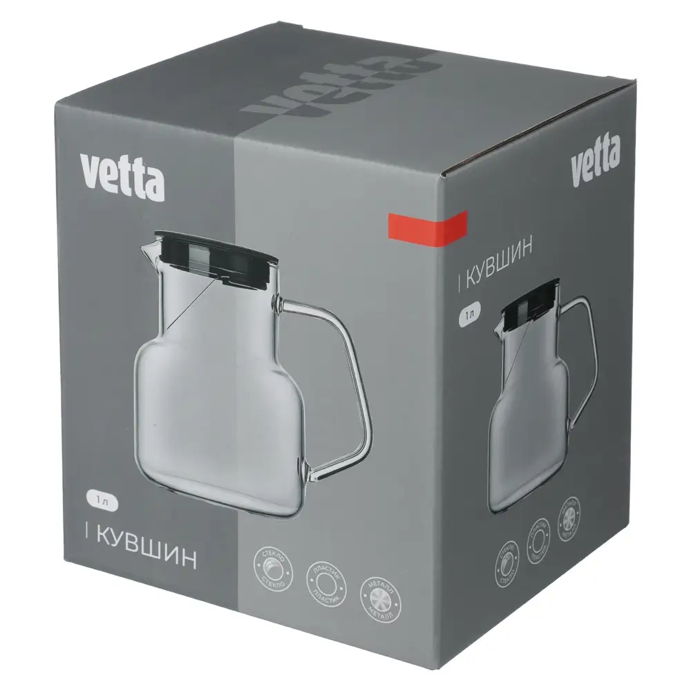 Кувшин VETTA объёмом 1 литр – небольшая, но приятная деталь, которая делает каждый день чуточку комфортнее. Изготовлен из прочного жаропрочного стекла, которое не впитывает запахи, не окрашивает напитки и легко моется. Прозрачные стенки позволяют видеть содержимое, а лаконичный дизайн гармонично впишется в любой интерьер. Эргономичная ручка и аккуратный носик обеспечивают комфорт при наливании. Крышка плотно закрывается. Подходит для воды, сока, чая или домашнего лимонада. Материалы: стекло, пластик, металл.