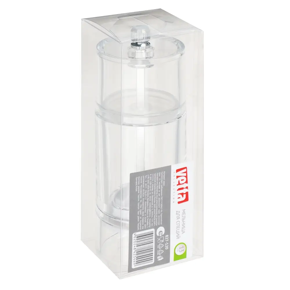 Мельница для специй VETTA, 13 см в прозрачном корпусе из акрила имеет лаконичный дизайн и надежную конструкцию. Острые керамические жернова правильной формы качественно перемалывают перец, не передавливая зерна и не окисляя их. Герметичная емкость не пропускает влагу и запахи, поэтому перец будет долго сохранять аромат и свежесть. Мельница имеет разборную конструкцию, поэтому ее можно мыть по мере необходимости. Прозрачный корпус позволяет следить за количеством содержимого.