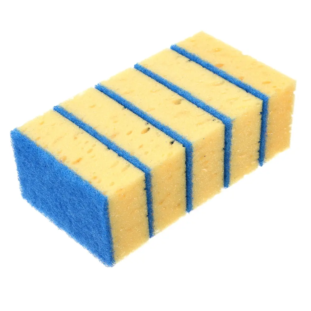 Губки для мытья посуды сделаны из яркого пористого поролона повышенной плотности. Особый bubble-поролон (бабл-пузырь) образует в 2 раза больше густой активной пены. Повышенной плотности и износостойкости фибра отлично и деликатно справляется со сверх сильными загрязнениями. Благодаря своей структуре губки эффективно удаляют загрязнения и значительно экономят моющее средство. Размер губок удобный для захвата рукой.