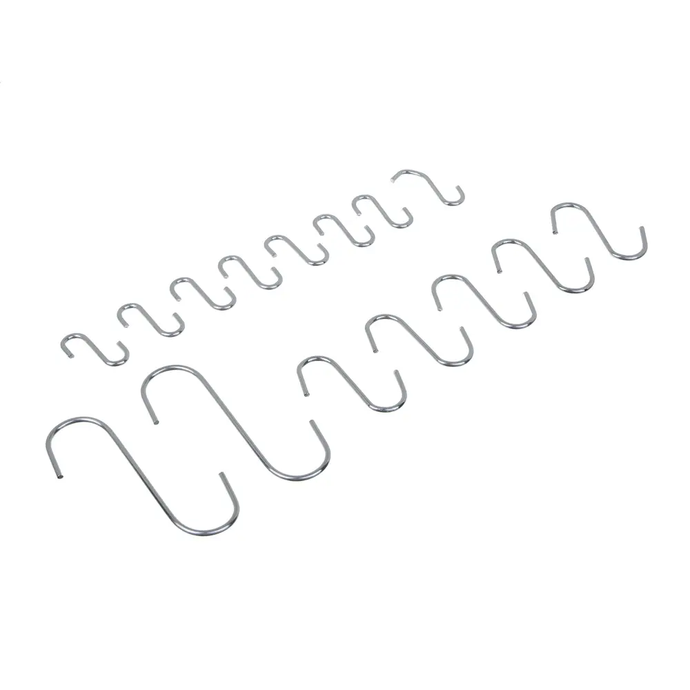 Крючки S-образные на кухонные рейлинги используются для хранения принадлежностей на рейлинге, штанге для полотенец, а также в шкафах и ящиках. Изделие имеет современный лаконичный дизайн и отлично впишется в интерьер помещения. В упаковке 15 штук разных размеров. Крючки изготовлены из качественной стали.