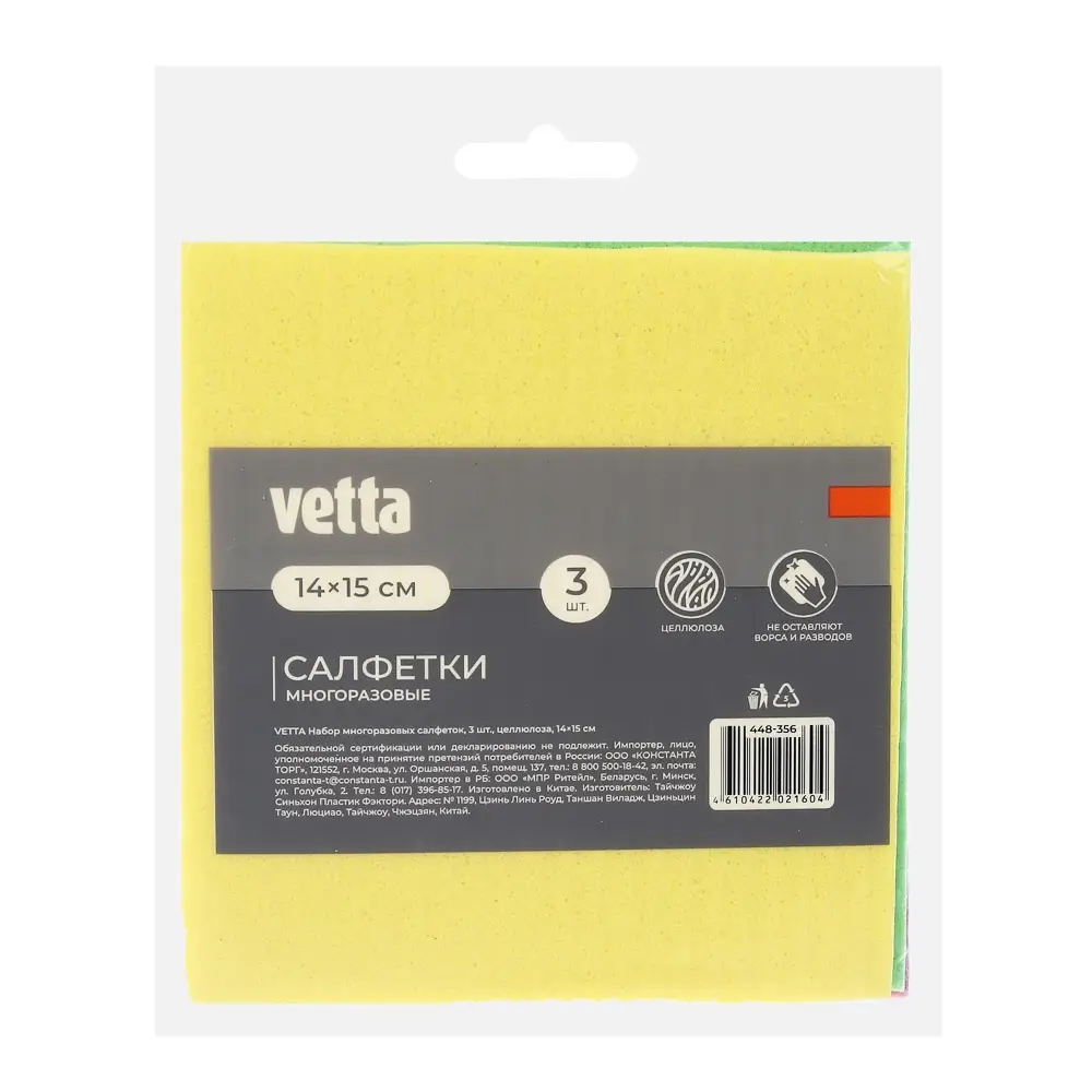 VETTA Набор многоразовых салфеток — идеальное решение для уборки дома и автомобиля. В комплект входят 3 целлюлозных салфетки размером 14x15 см, которые эффективно впитывают влагу и удаляют загрязнения. Салфетки многоразовые, их можно стирать и использовать снова. Они идеально подходят для очистки стёкол, зеркал, мебели, автомобиля и других поверхностей.