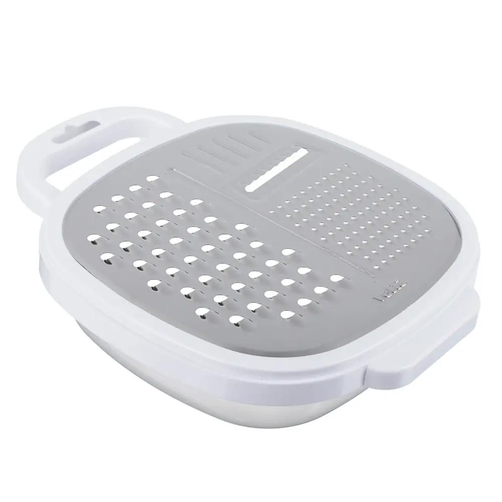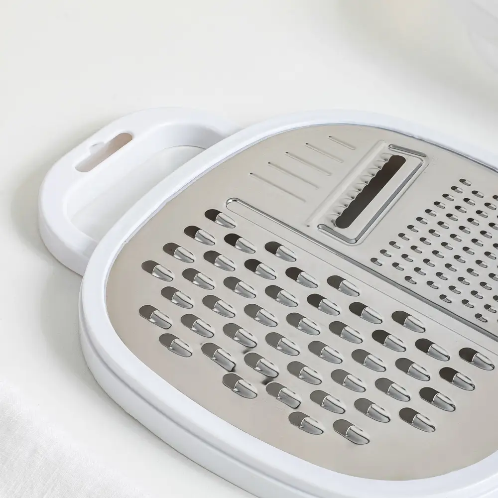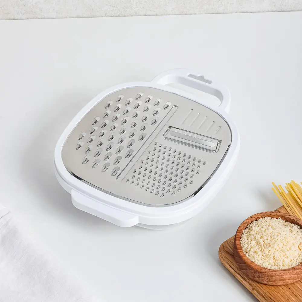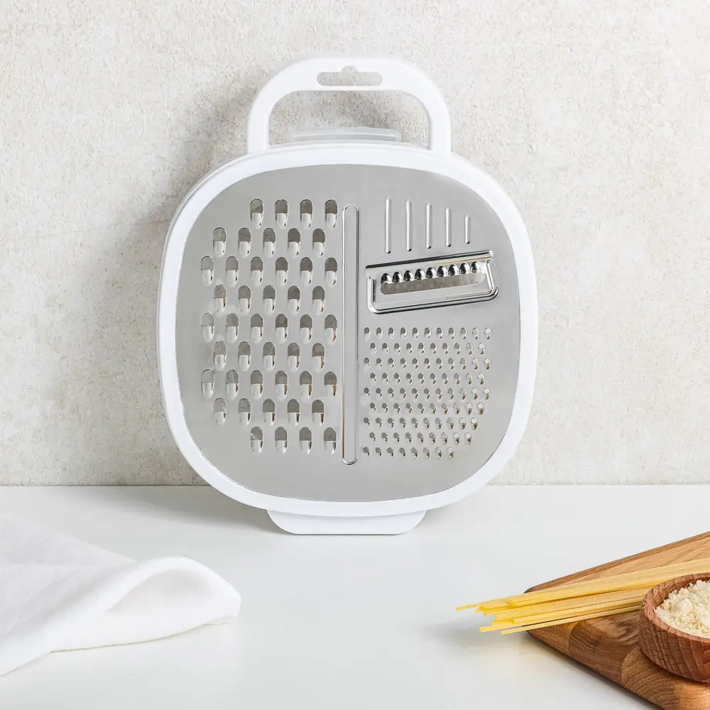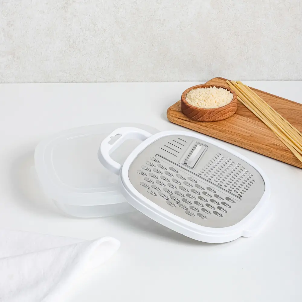 Горизонтальная терка с контейнером обеспечит чистоту на кухне: измельченный продукт сразу попадает в контейнер, что очень удобно. Потом остается только открыть крышку-терку и продолжить приготовление пищи.