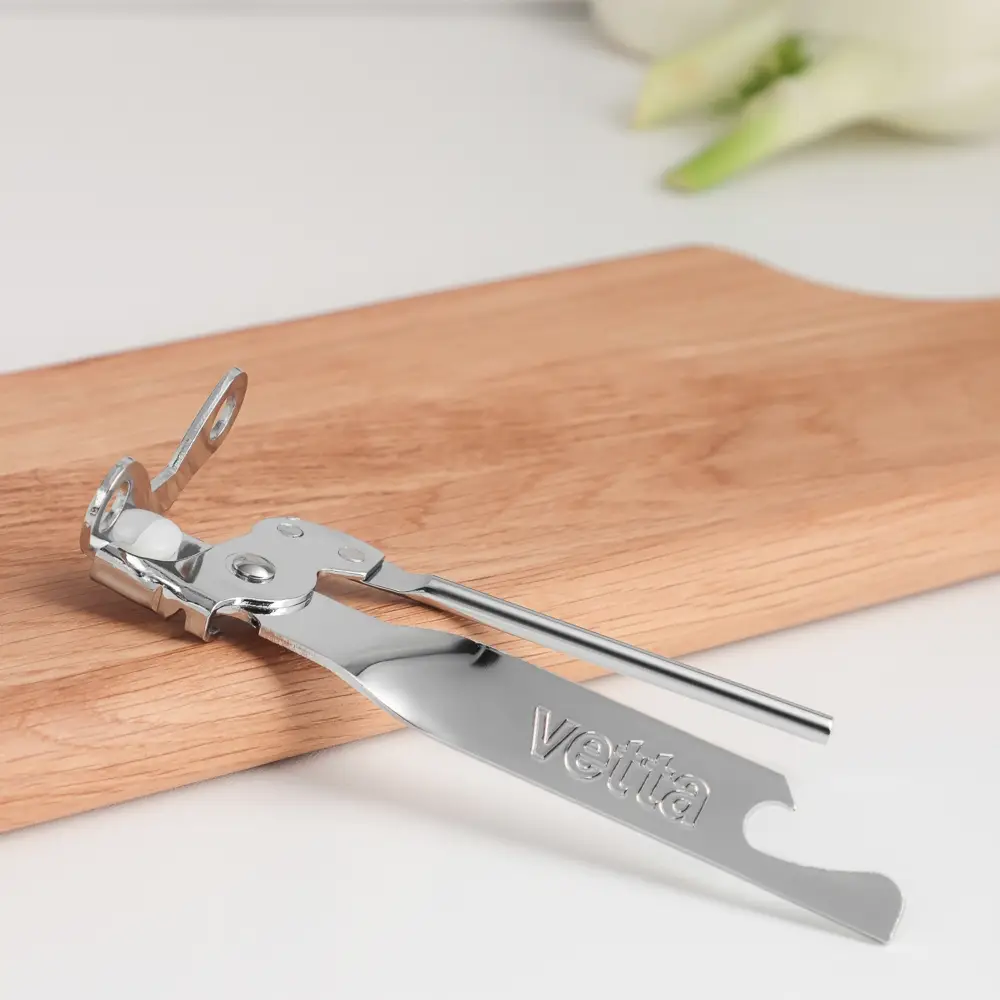 Универсальная открывалка VETTA один из нужных приспособлений на кухне. С ее помощью можно открыть емкости разных типов: бутылки с металлическими крышками, консервы в жестяной упаковке, банки с заготовками.