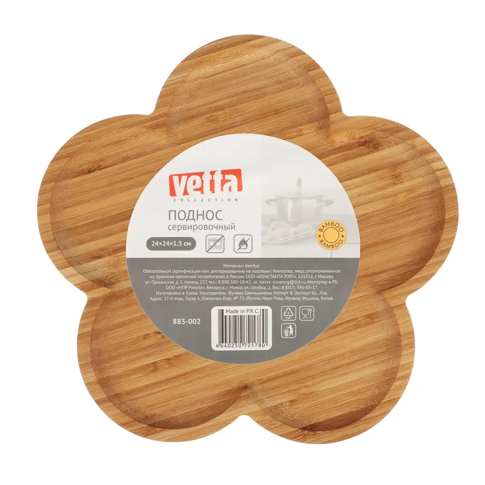 Поднос сервировочный VETTA изготовлен из качественного и экологически чистого материала - бамбука. В обычный день он станет романтическим украшением кухонного интерьера. Но как только нужно преподнести гостям кофе и закуски, поднос станет главным организатором красивой подачи блюд. Размер подноса составляет 24x24x1,5 см, и он имеет оригинальную форму пятилистника, что привносит особый шарм в сервировку блюд.