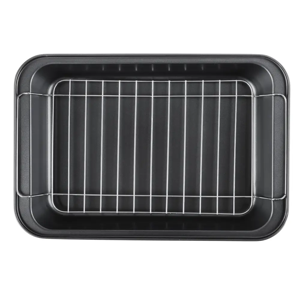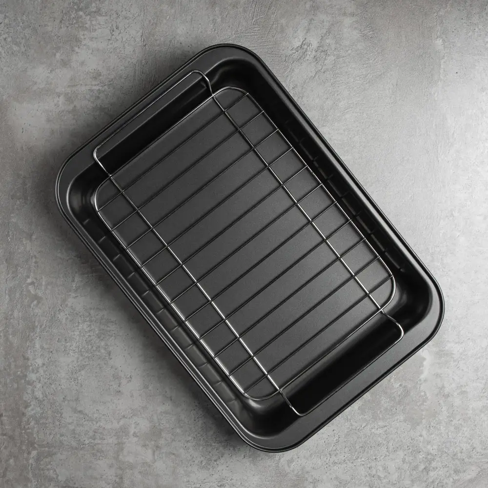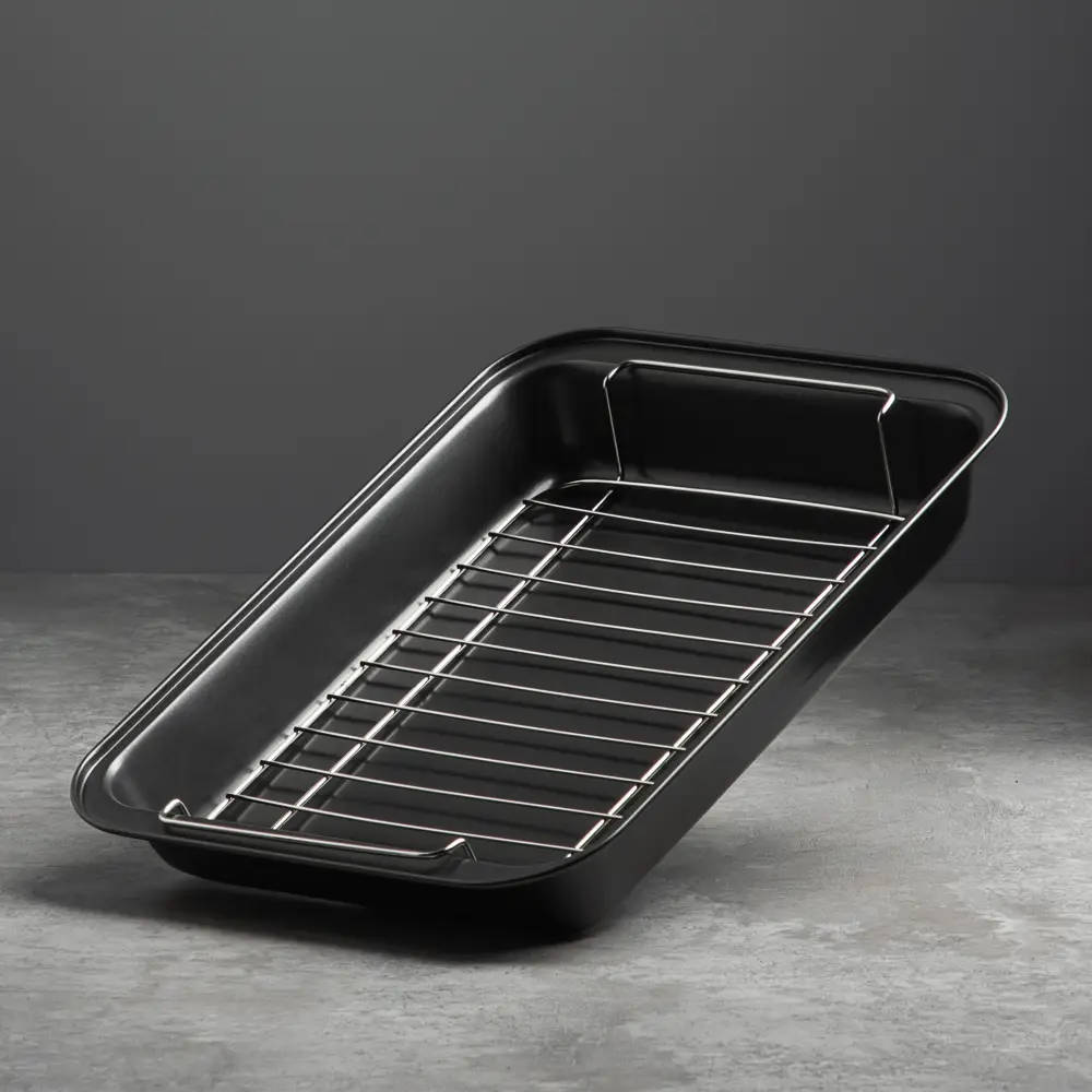 Готовьте аппетитные блюда-гриль прямо в вашей духовке! Глубокий противень с решеткой VETTA Ростер позволяет готовить максимально полезные блюда с красивыми полосками-гриль. Изделие из углеродистой стали имеет безопасное антипригарное покрытие и легко моется. Для приготовления диетических блюд уложите мясо и овощи на решетку и запекайте до готовности. Лишний жир останется под решеткой на дне противня. Противень Ростер – радость для каждой хозяйки!