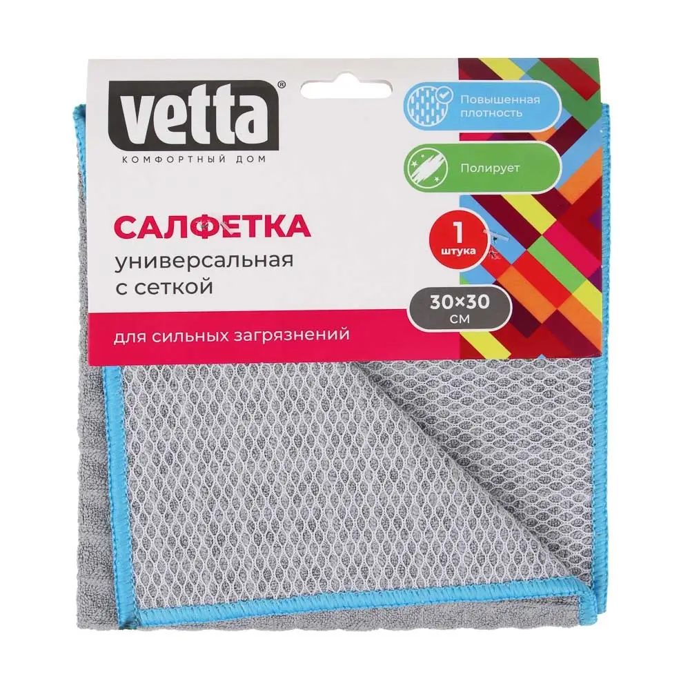 Салфетка из микрофибры VETTA с сеткой «Вафля» 30х30 см плотностью 330 г/м2 имеет две поверхности, что позволяет делать уборку более быстро и эффективно. Грубая поверхность с сеткой эффективно справляется с сильными загрязнениями, включая въевшиеся пятна, нагар, жир, остатки пыли и грязи после ремонта. А мягкая сторона с махровым ворсом полирует, впитывает лишнюю влагу, удаляет разводы и оставляет после себя зеркальный блеск. Изделие плотное, практичное и долговечное.