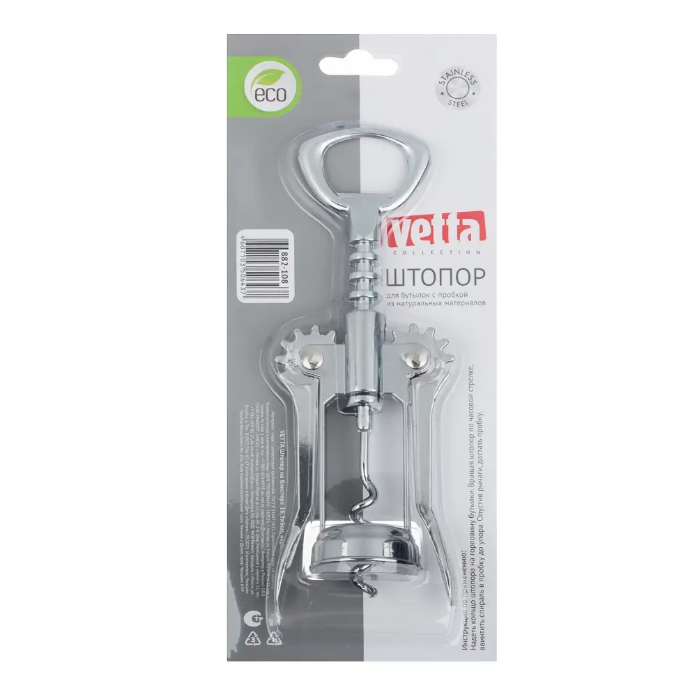 Штопор VETTA на блистере предназначен для откупоривания бутылок с пробкой из натуральных материалов. Верхняя часть штопора также является открывалкой для бутылок. Изделие изготовлено из качественное нержавеющей стали, эффективно открывает бутылки, не требуя физических усилий.