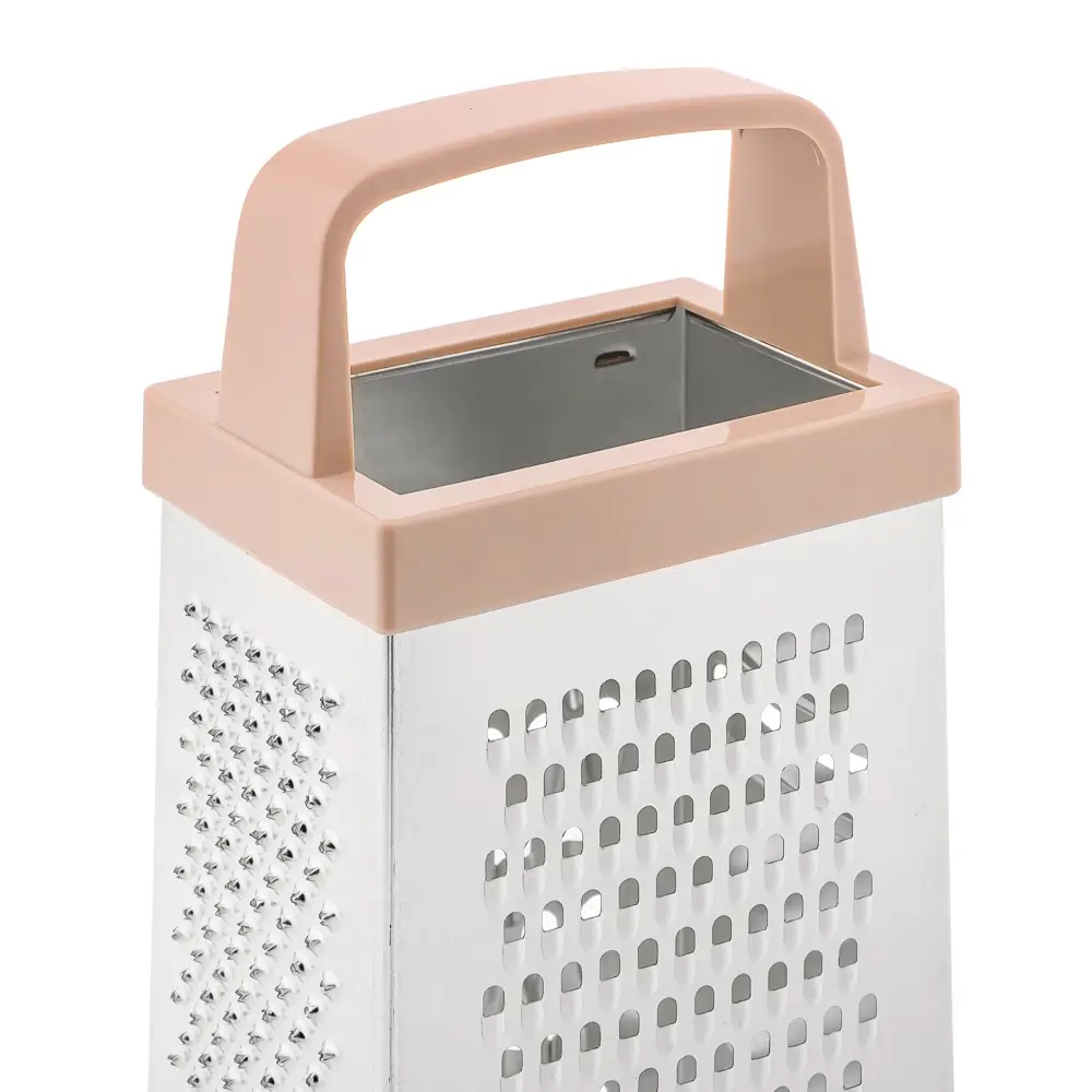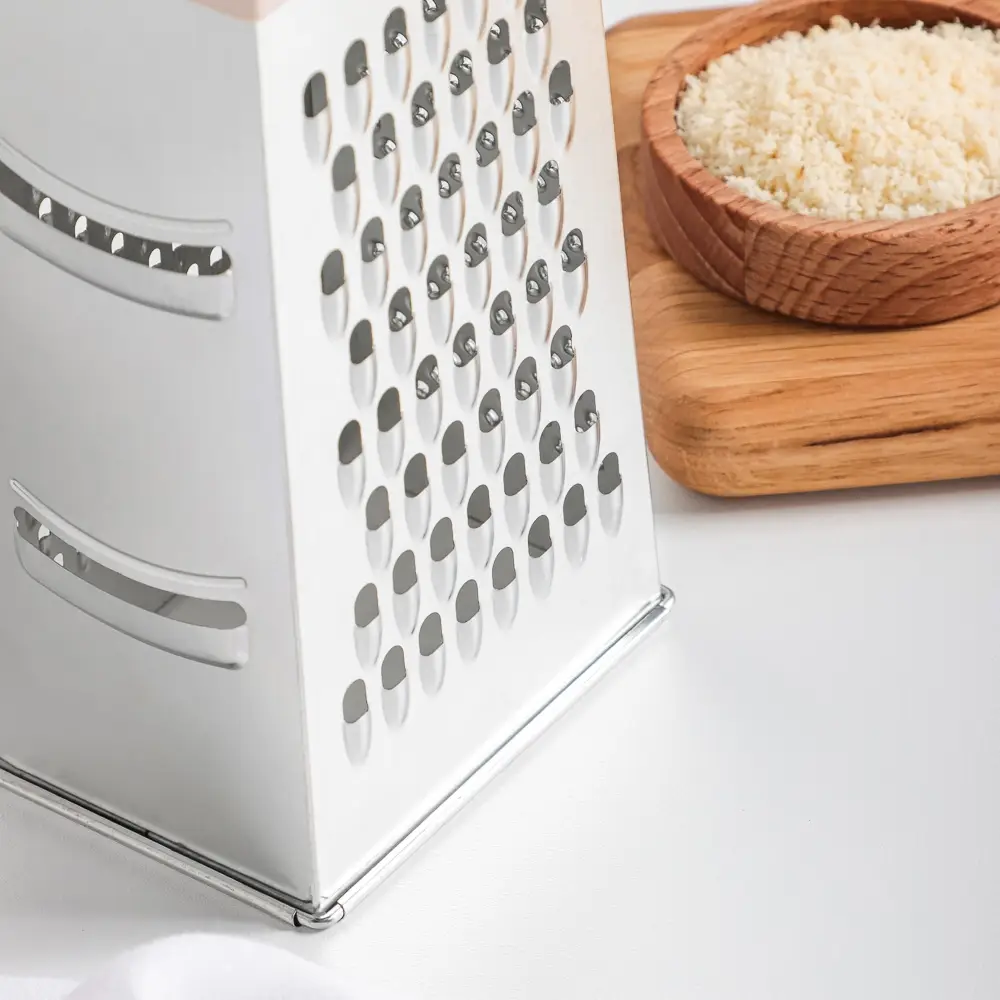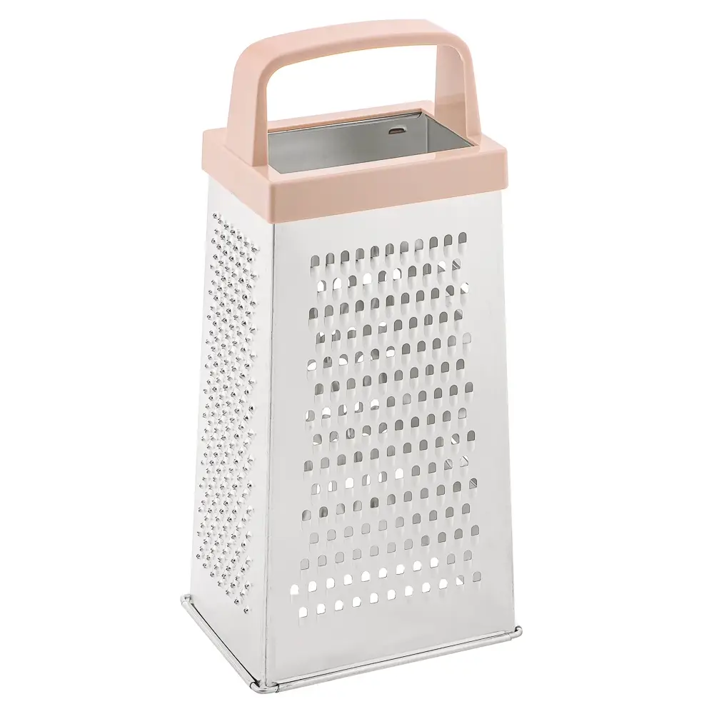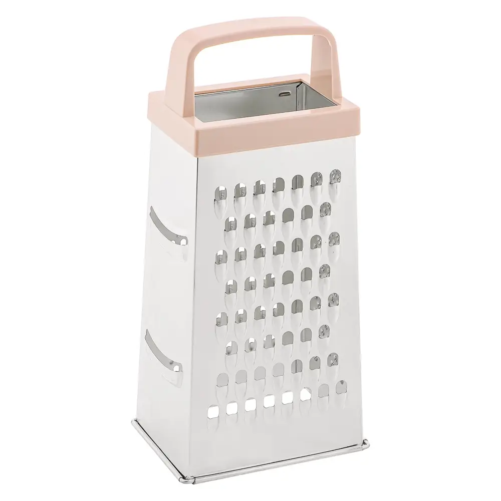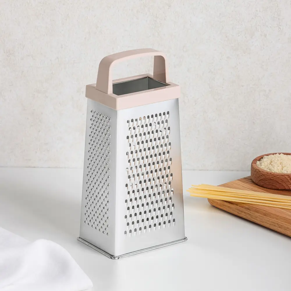Терка 4-х сторонняя VETTA, высотой 23 см, изготовлена из прочной жести с хромированным покрытием — надёжный и универсальный инструмент для любой кухни. На каждой из четырёх граней — разная насечка: крупная и мелкая терки для сыра, овощей и фруктов, щётка для очистки овощей и нож для нарезки или шинковки. Удобная пластиковая ручка обеспечивает надёжный и комфортный захват даже при влажных руках, а широкое основание устойчиво стоит на столе без скольжения. Идеально подходит для быстрого измельчения картофеля, моркови, капусты, сыра, шоколада и других продуктов. Легко моется, не ржавеет и долго сохраняет остроту лезвий.