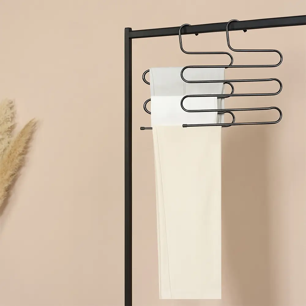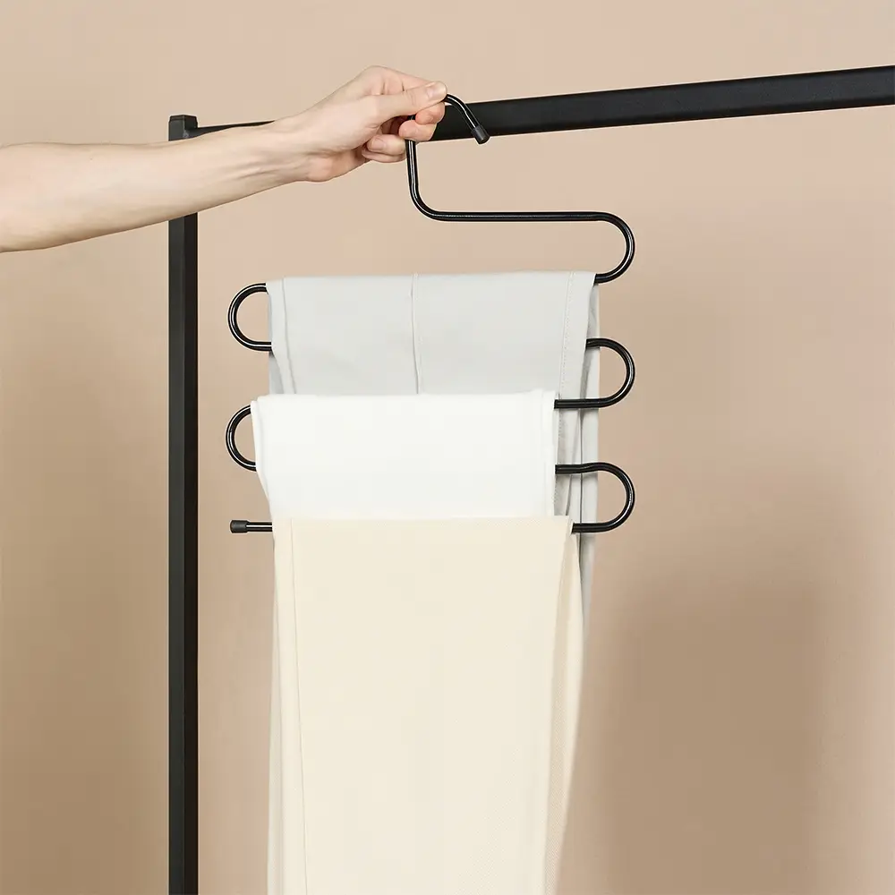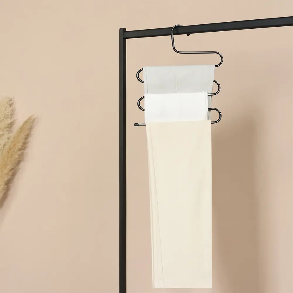 Вешалка для брюк облегчает хранение одежды и помогает избежать деформации вещей. Имеет поворотную головку, что позволяет удобно размещать их в шкафу. Идеально подходят для открытого хранения, так как благодаря минималистичному дизайну и нейтральному цвету не создают лишнего визуального шума.