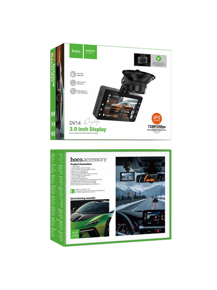 Hoco DV14 – компактный автомобильный видеорегистратор с камерой разрешением 1280×720p и углом обзора 140°, который позволяет фиксировать все детали дорожной ситуации. Устройство оснащено 3-дюймовым IPS-экраном с разрешением 360×640 для удобного просмотра видео прямо в автомобиле. Видеорегистратор поддерживает карты памяти до 128 ГБ, оснащен датчиком движения, ночным режимом и функцией циклической записи, что обеспечивает непрерывную фиксацию событий на дороге. Встроенный аккумулятор емкостью 200 мАч и кабель длиной 3,5 метра позволяют удобно разместить устройство на лобовом стекле, а корпус из ABS-пластика размером 88×51×34 мм и весом 68 г делает регистратор компактным и практичным. Простое управление и поддержка 22 языков делают Hoco DV14 универсальным решением для безопасного вождения, позволяя водителю всегда быть уверенным в записи всех важных событий и удобстве использования устройства.