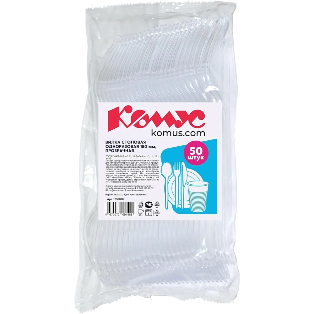 Вилка одноразовая Комус прозрачная, 18 см, ПС 50шт./уп