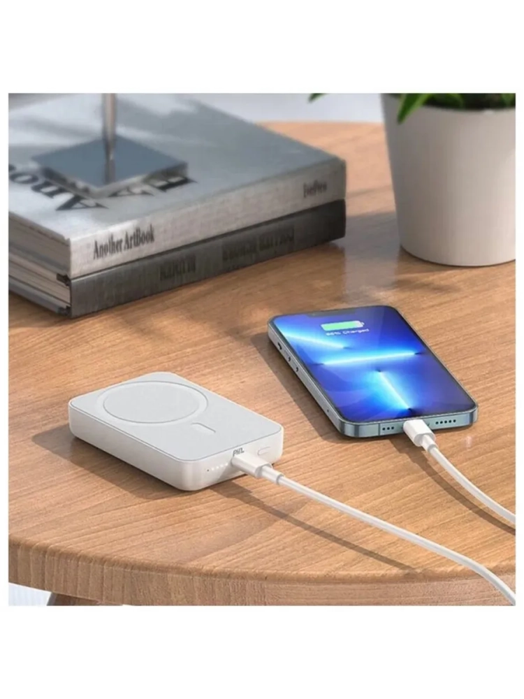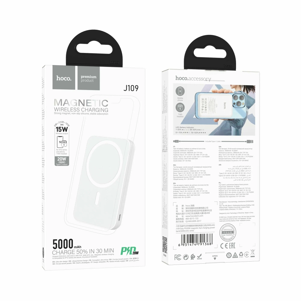 MagSafe Hoco j109. Портативный аккумулятор Hoco J109 MagSafe станет отличным дополнением для вашего iPhone, благодаря которому вы дольше сможете пользоваться всеми его возможностями без ограничений. Данная модель источника питания обладает емкостью 5000 мА*ч, благодаря чему заряда вашего смартфона хватит на значительно большее время. Для дополнительного удобства устройство поддерживает технологию быстрой беспроводной зарядки за счет мощности в 15 Вт. А напрямую через провод выдает 20Вт. Портативный аккумулятор Hoco J109 MagSafe также отличается компактными размерами и небольшим весом, что позволит с легкостью установить устройство на заднюю панель вашего смартфона. Модель выполнена в корпусе из качественного и приятного на ощупь пластика, а также отличается лаконичным дизайном. Для зарядки портативного аккумулятора используется фирменный коннектор Lightning. Устройство поставляется в фирменной упаковке. Перед первым употреблением устройство желательно полностью зарядить! Время первой зарядки будет около 2 часов. При выборе устройства следует понимать, что данный девайс был создан инженерами для экстренной дополнительной подзарядки телефона в пути без розеток и провода на недолгий промежуток времени. Это устройство позволит зарядить стандартный телефон полностью, версию "макс" - не менее 80%. Встроенные магниты этой версии устройства сильны.