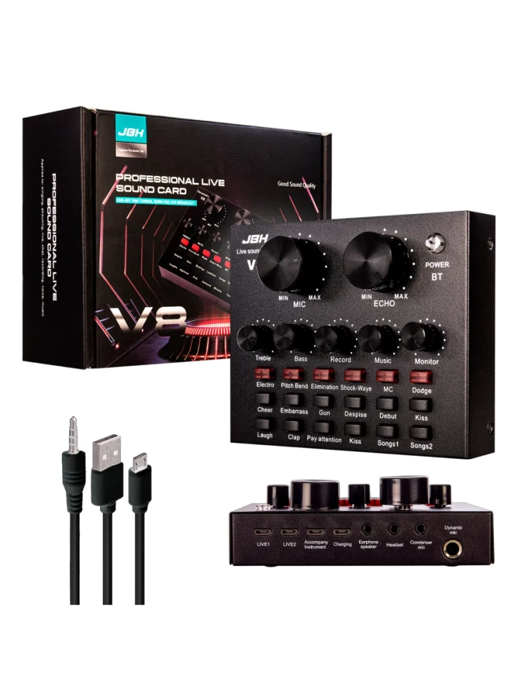 Внешняя звуковая карта V8 JBH — это компактное и многофункциональное устройство, предназначенное для улучшения качества звука при записи и трансляциях с микрофона, а также для работы с компьютерами и мобильными телефонами. Она поддерживает подключение через USB и Bluetooth, совместима с iOS и Android, что делает ее универсальным решением для стримеров, блогеров и музыкантов. Устройство обладает прочным металлическим корпусом и компактным дизайном, что обеспечивает удобство использования и долговечность. Звуковая карта V8 JBH позволяет настраивать звук микрофона и воспроизведения с помощью удобной панели управления, поддерживает различные звуковые эффекты и режимы изменения голоса. Она подходит для работы с наушниками и гарнитурами, а также для прямых трансляций и записи аудио на разных платформах. Для включения и выключения предусмотрена кнопка питания с индикацией состояния. Встроенный аккумулятор обеспечивает автономную работу без подключения к сети до 12 часов. Таким образом, V8 JBH — это универсальный и функциональный микшер-звуковая карта, которая улучшит качество звука и обеспечит удобство настройки для пользователей с разными задачами — от стриминга до профессиональной записи аудио.