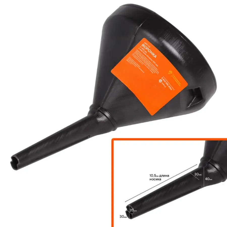 Воронка поможет аккуратно произвести процесс переливания жидкостей. Данная воронка имеет диаметр 190 мм. Благодаря большой горловине воронки изделие подходит для переливания большого объема жидкости. Воронка укомплектована стальной специальной мелкоячеистой сеткой для фильтрации мусора при переливании.