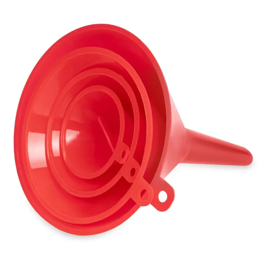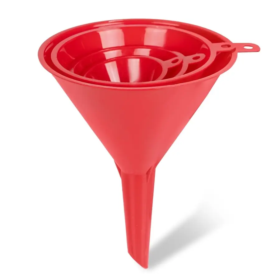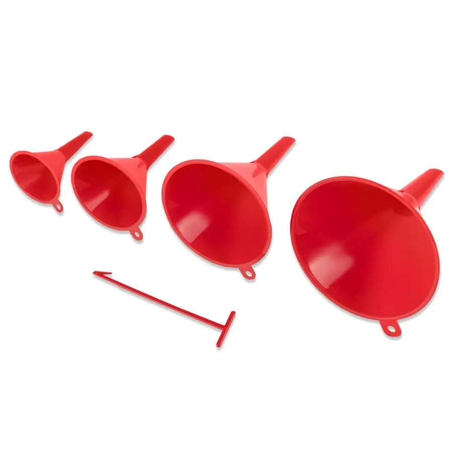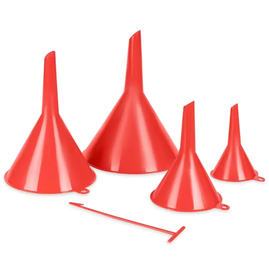 Комплект автомобильных воронок для заливки технических жидкостей. В комплекте 4 воронки с диаметром заливных горловин: 50, 75, 95, 115 мм. Материал устойчив к воздействию агрессивных технических жидкостей, а именно: топливо, кислоты, щёлочи, растворы солей.